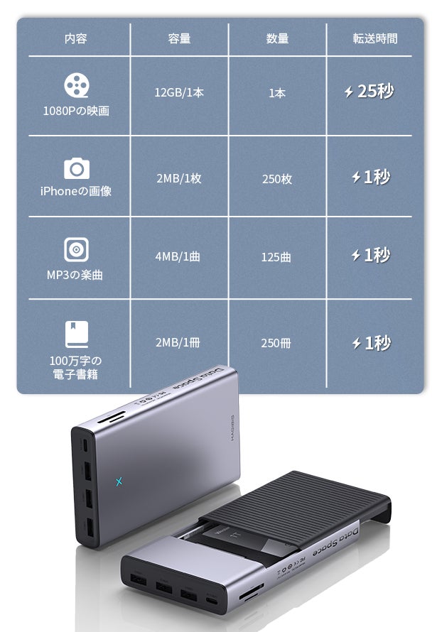 スピーディーなデータ転送が可能なHAGIBISドッキングステーションがあれば、HD画質の映画を25秒で転送できます。このほか、音楽や画像などのコピーもストレスゼロです。