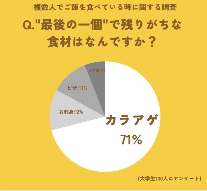 ②大学生100人中7割以上が、最後に残りがちなものとして“唐揚げ”と回答