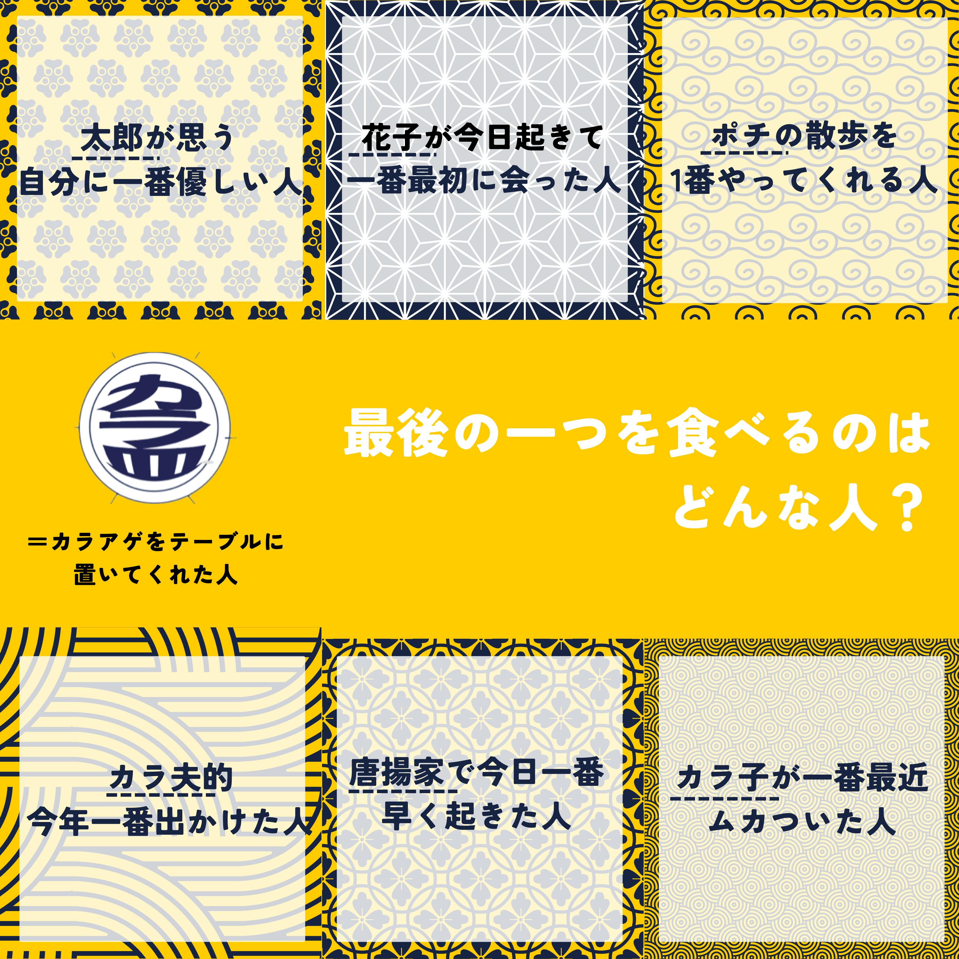 デザインに関しては、多少の変更がある場合がございます。また、ランダムで唐揚げに関するモチーフをご用意するため、ご希望等はお伺いしかねます。あらかじめご了承ください。