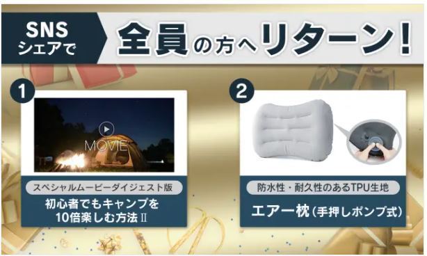 お世話になっております。ご支援頂きました方々、深く感謝いたします。誠にありがとうございます。今回は、『SNSシェアキャンペーン』のご案内と、お願いがございます。ご支援頂いた方は、このページを、あなたのSNSでぜひ紹介するだけで、全員に「ムービー&エア枕」を、追加リターンします!▶あなたのSNS投稿に、一言コメント入れていただき、下記のURL↓↓を貼り付けて投稿お願い致します。https://camp-fire.jp/projects/view/635683?utm_campaign=cp_po_share_mypage_projects_show※SNSシェアをされた方は、メッセージにて「SNS投稿されたURL」をご報告お願い致します。SNSシェアだけで、『ムービー&エア枕』をお送りいたします。宜しくお願い致します。