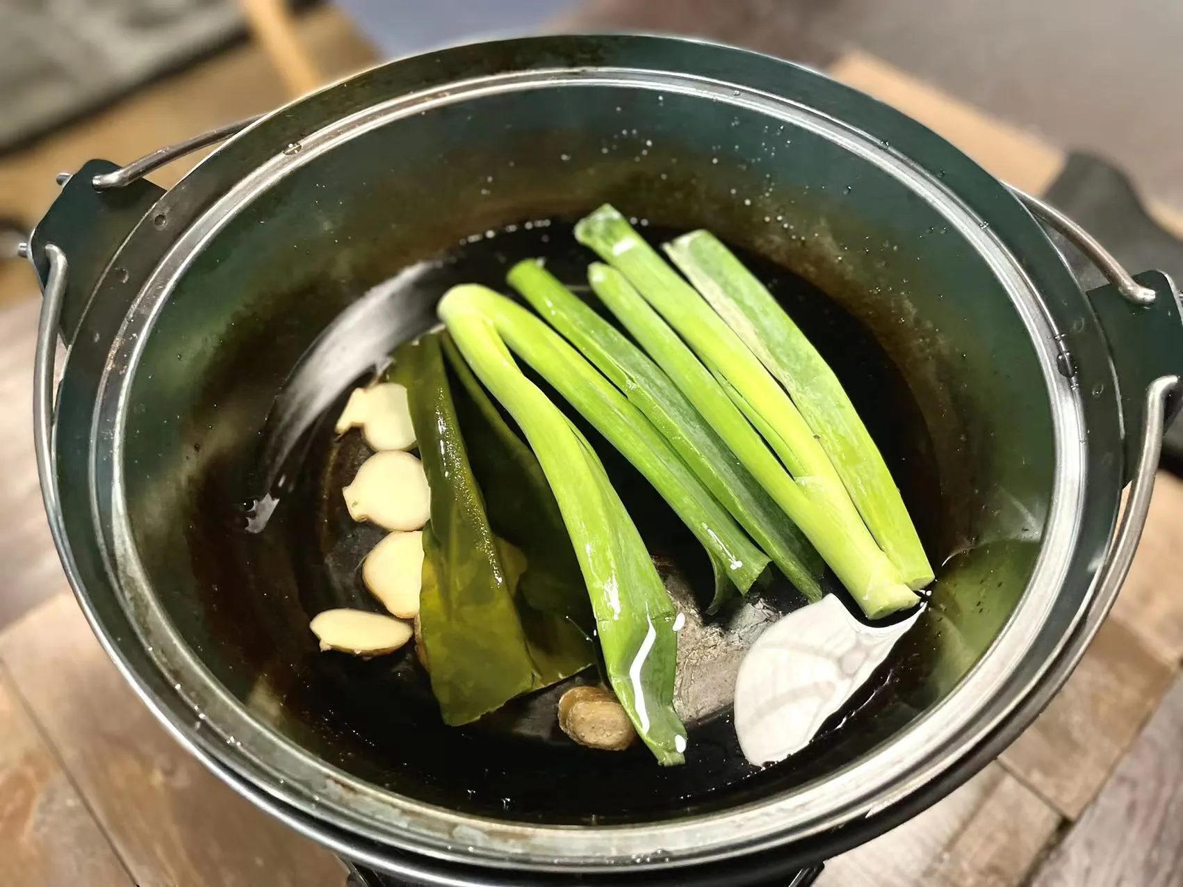 水・・・1ℓ、料理酒・・・100CC、ネギ青い部分・・・2本、生姜・・・親指サイズ、出し昆布・・・1枚を入れる。