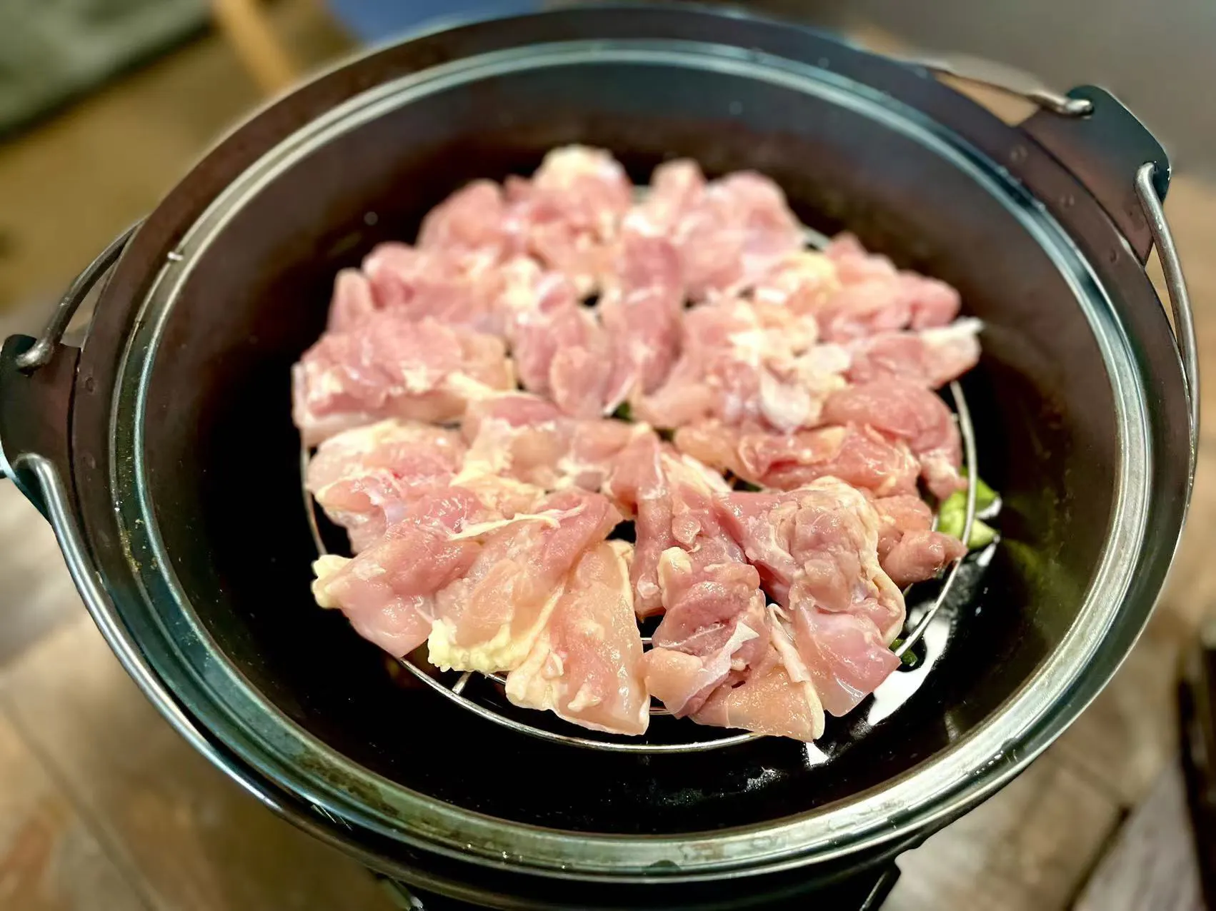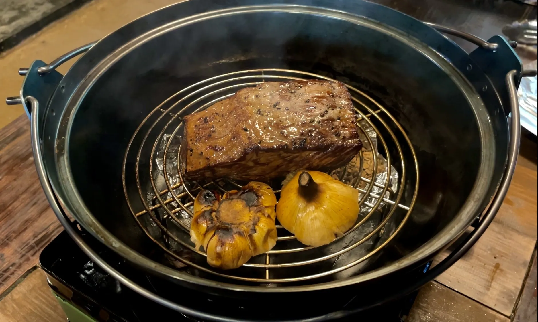 燻製はしたいけど、スモーカーでの温燻製は、数時間~1日も掛かる。熱燻製する為にわざわざ空焚きに使っても良い古い鍋を持って行く?