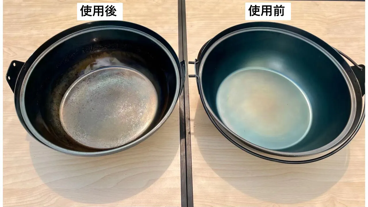 ・鍋料理では多くの水分や食材からの塩分が含まれておりますので、鍋に残った料理を放置すると食材に鉄の匂いが移り鉄臭くなり、酸化被膜が剥がれ、錆びの原因となります。鍋に残った料理は、別容器に移し、温かいうちにスポンジや亀の子たわし等で洗浄し乾かしてください。