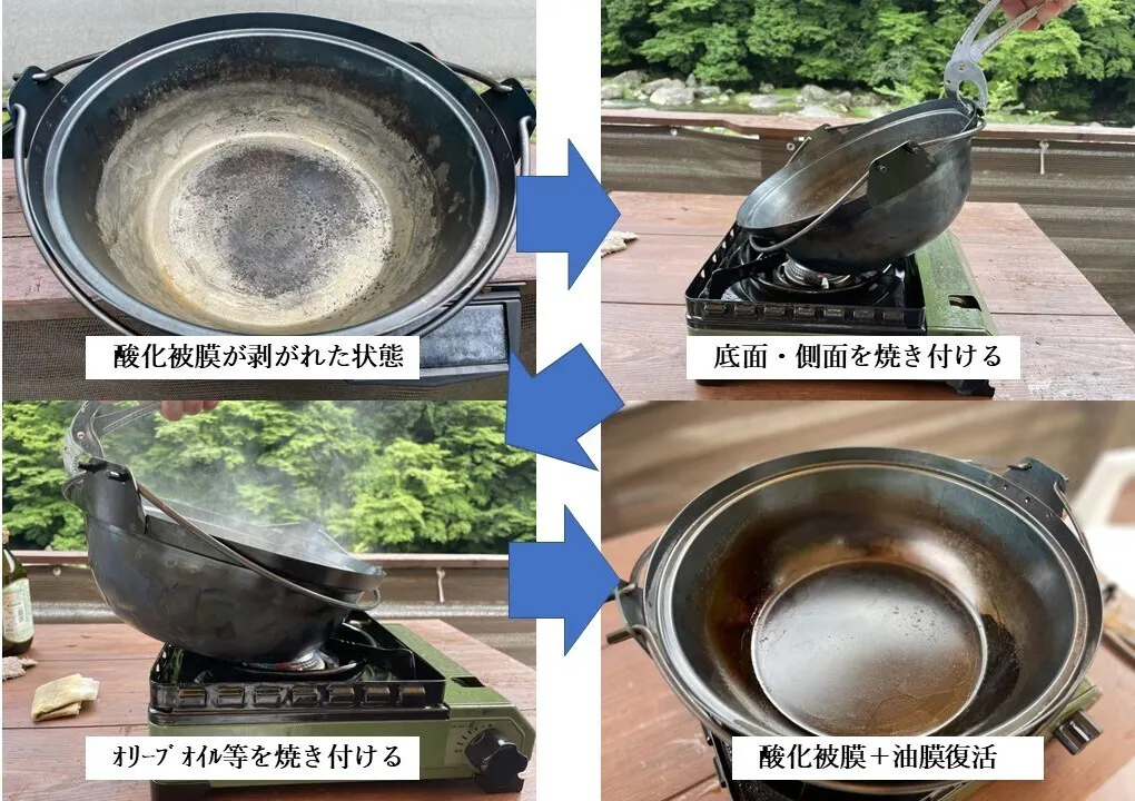 ・料理の種類や方法、また残った食材を鍋の中に放置する事により酸化被膜が剥がれる恐れがあります。剥がれた状態でもお使いいただく事に問題はございませんが、錆びやすい状態となっておりますので下記の方法で酸化被膜を復活させてる事が可能です。