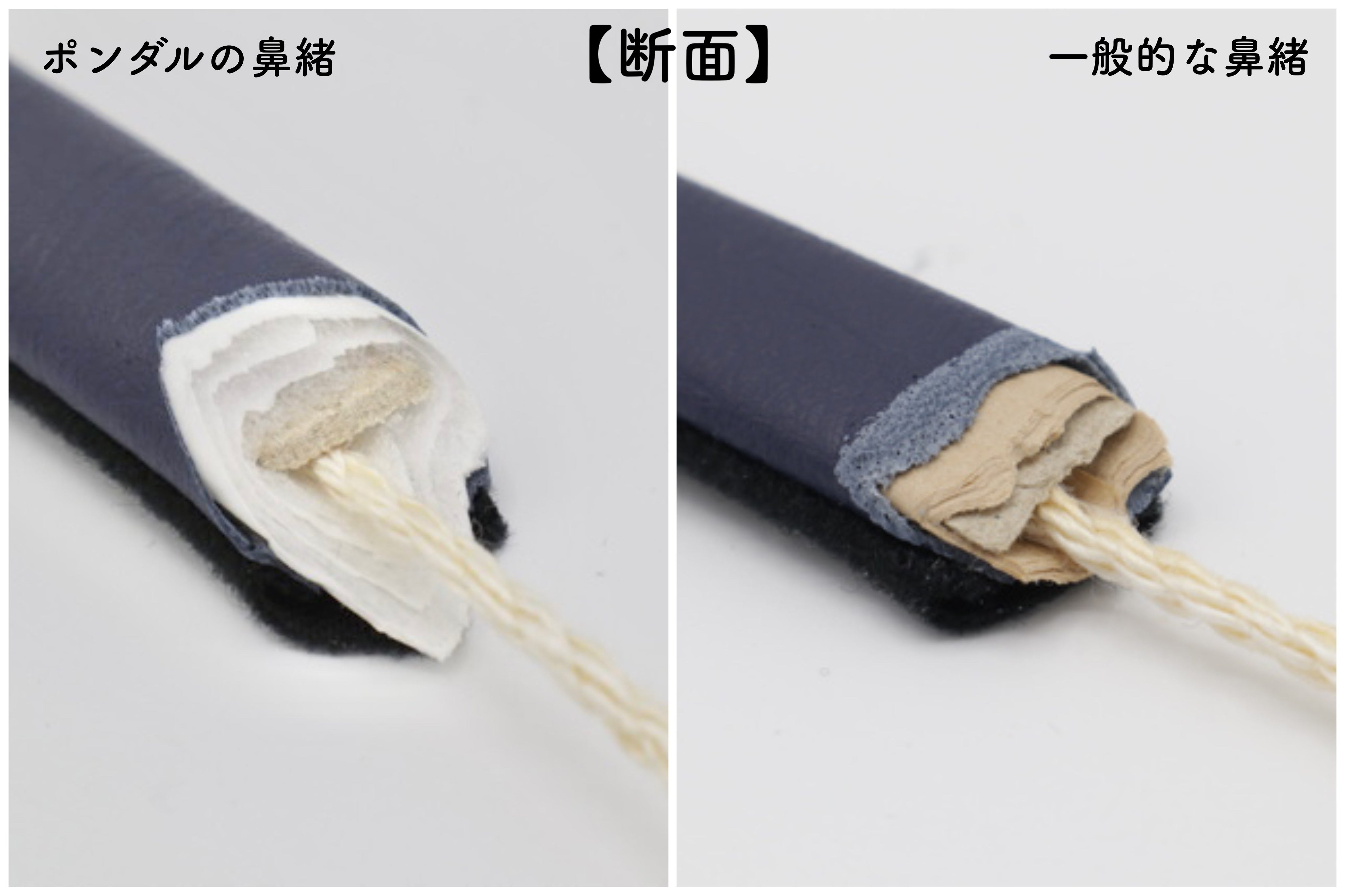 一般的な鼻緒は厚めの芯紙に茶色の薄紙を巻いて中に入れています。クッション性はほとんどなく、かなり硬い鼻緒です。鼻緒の痛みの原因の一つにこの芯材があります。
