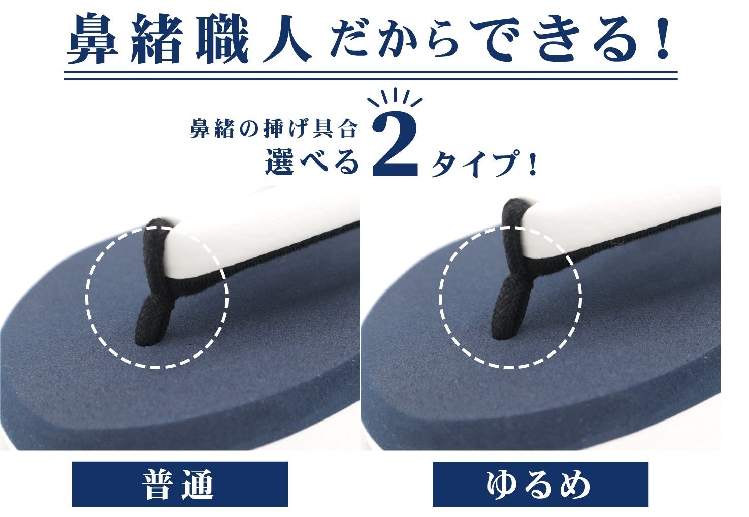 【画像左】鼻緒調整:普通(坪下1㎝) / 【画像右】鼻緒調整:ゆるめ(坪下1.5㎝)