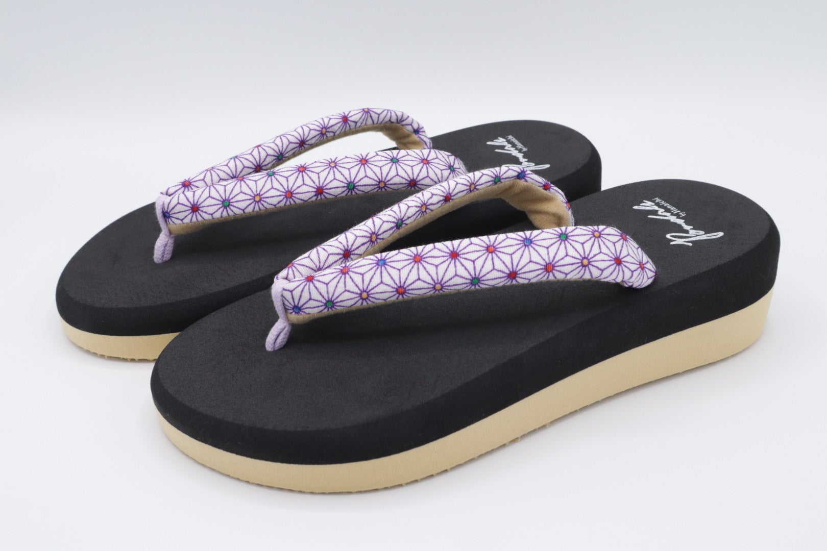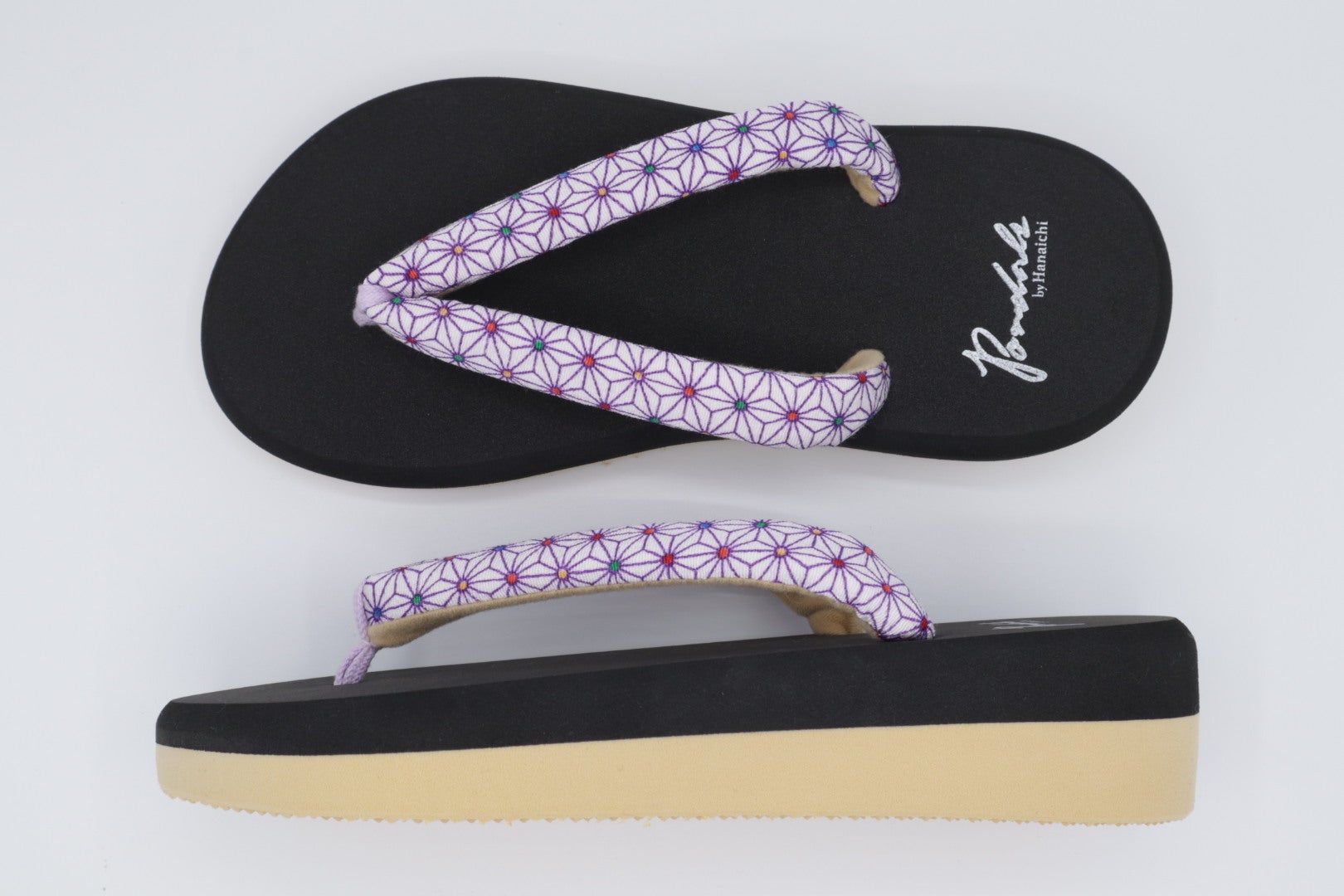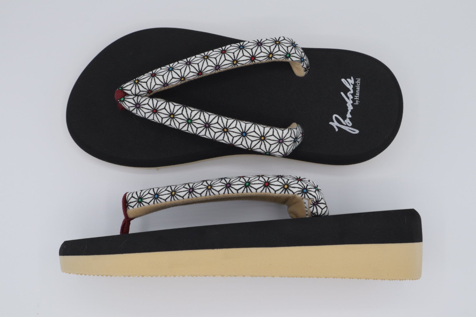 「ポンダル彩〜いろどり〜」はタウンユースを想定して開発した本格的な鼻緒の付いた和テイストの履物です。タウンユースはもちろんのこと、浴衣やライト感覚の和装に合わせて履いても全く違和感がありません。また、台はスニーカーのソール用に開発したEVAを使用しており、スニーカーならではの適度な“しなり”が快適性と歩きやすさを向上させます!