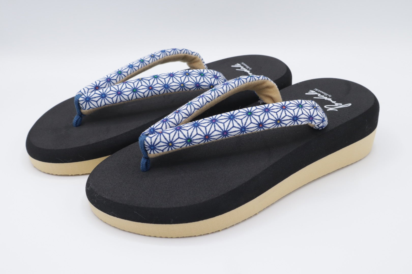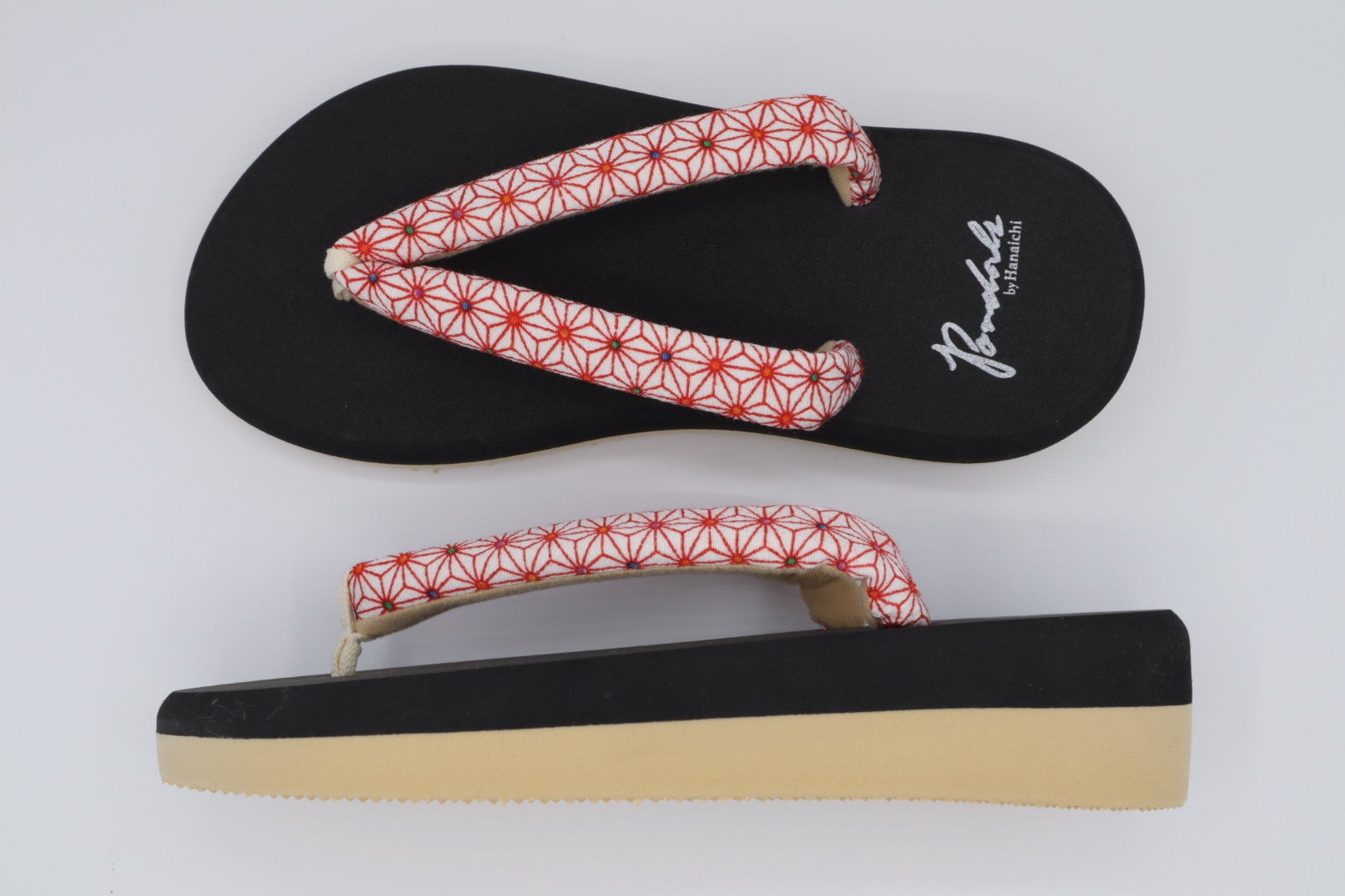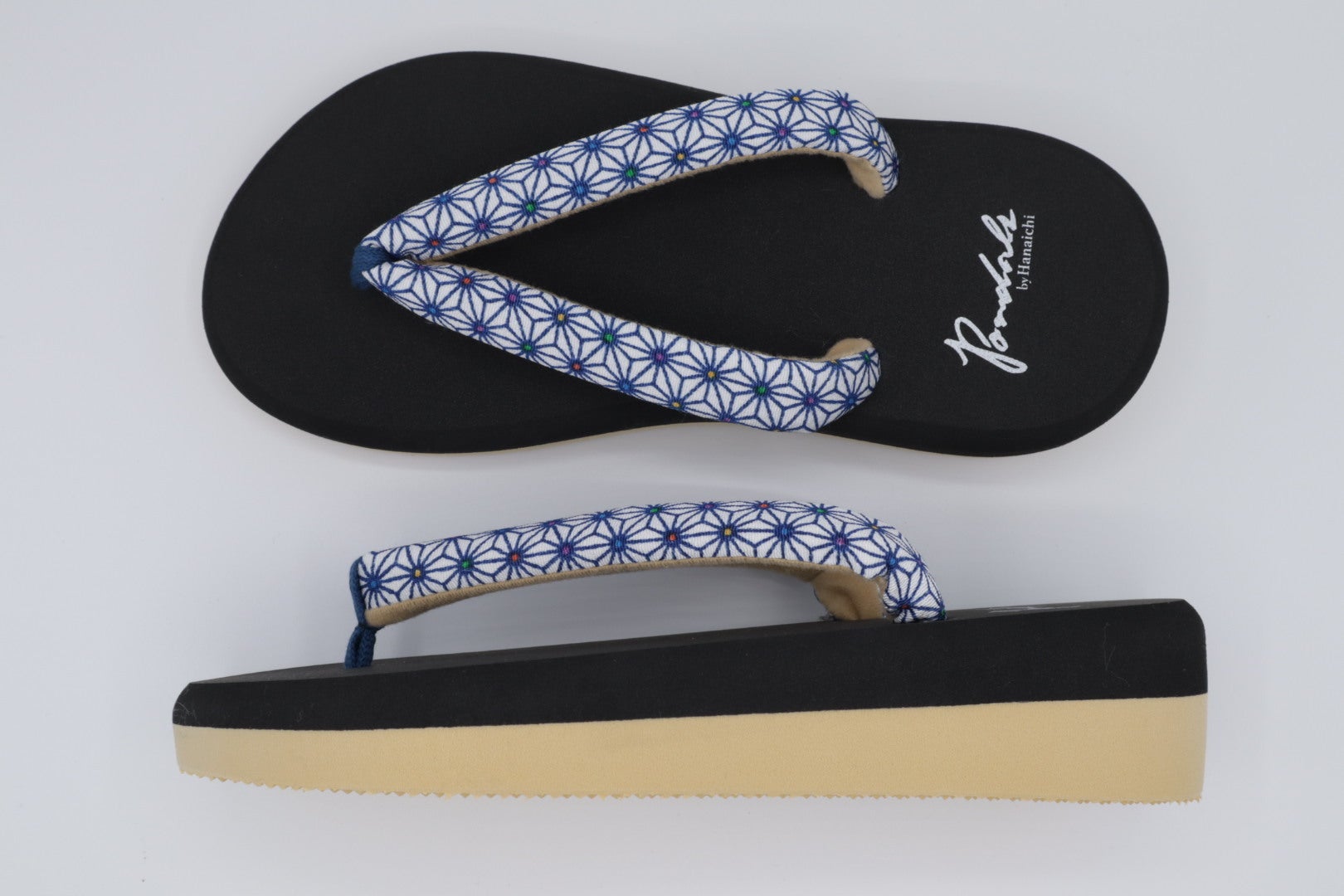 ポンダルは和装履物から派生した新感覚の履物です。今回、BOOSTERでお披露目する「ポンダル彩〜いろどり〜」には伝統的な和柄の一つである麻の葉柄を鼻緒に採用しました。麻の葉は成長が早く、真っ直ぐに伸びることから、麻の葉柄は古より子供の健やかなる成長を願う柄模様として広く親しまれてきました。最近では「鬼滅の刃」のヒロイン竈門禰豆子が着ている着物の模様としても有名ですよね。