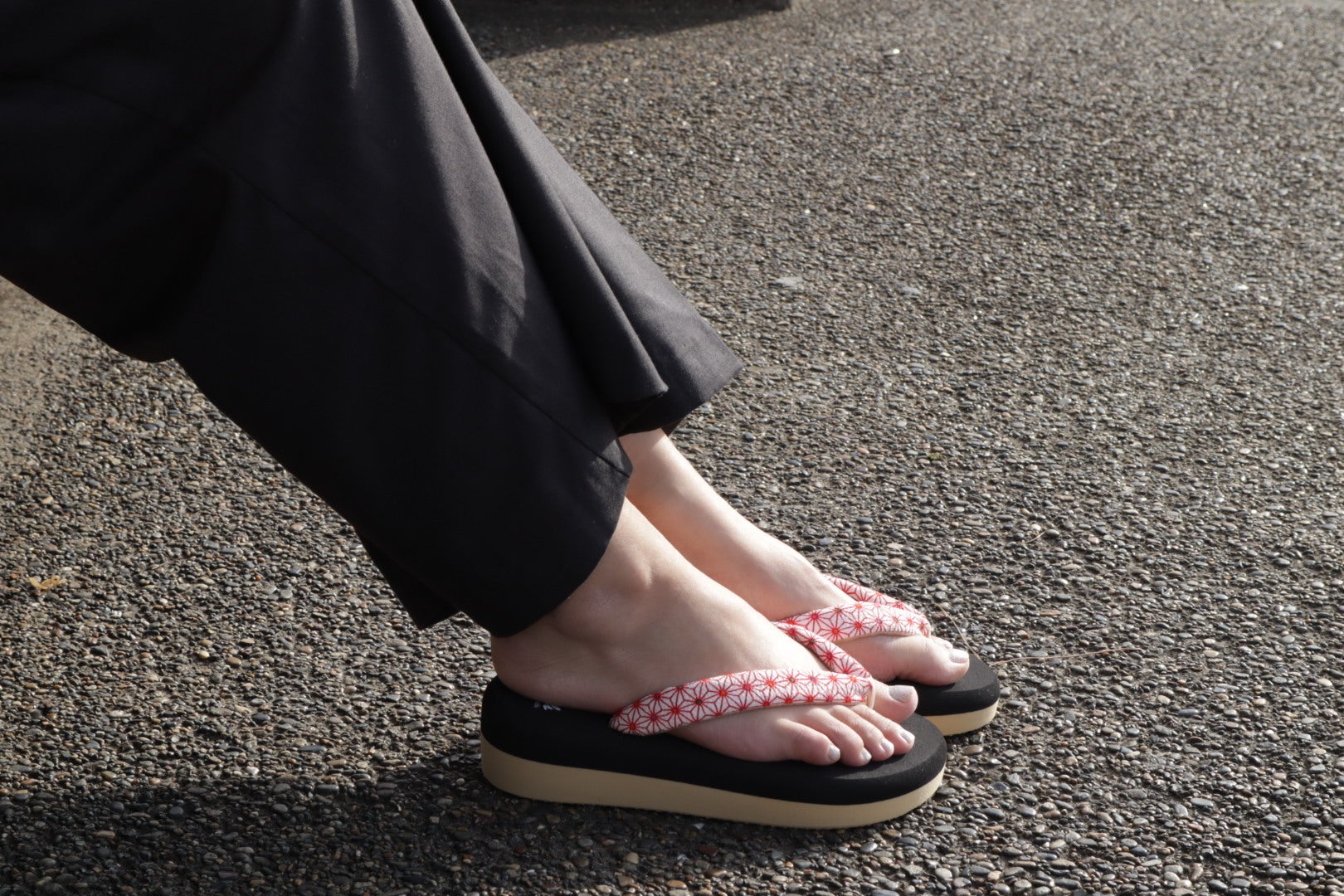 草履や下駄、雪駄などの和装履物は足の小指が外側に出るデザインが一般的です。足の小指が外側に出ていると足裏が汚れやすく、また足裏に違和感を覚えることがあります。一方、ポンダルは足の小指が台の外側に出ないデザイン(3E相当)を採用していますので、足裏の汚れを心配なく履くことができます。