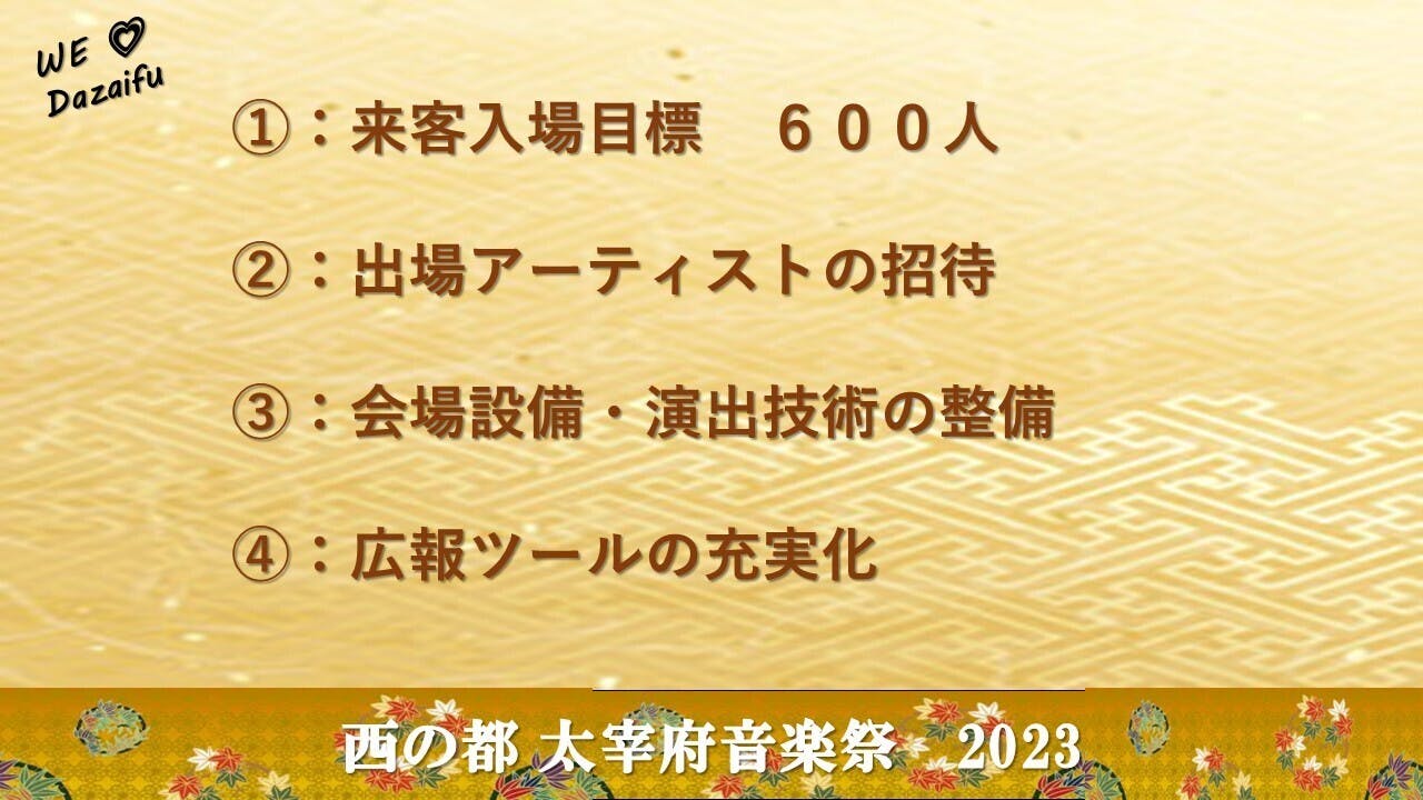 西の都であった太宰府の歴史文化を音楽という切り口で表現し、国内外に発信して参ります。この音楽祭を通して、さらに大きく太宰府の魅力を皆さんに知っていただければ本当に嬉しい限りです。音楽祭に関係するスタッフ一同、このクラウドファンディングには大きな期待を寄せています。そこで今回、『西の都太宰府音楽祭2023』では、以下の4つを目標に開催活動をスタートして参ります。