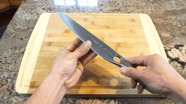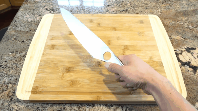 包丁の中央に穴を開けることでグリップしたときにバランスをとりやすくしました。
