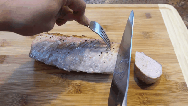 このおかげで腕の力で食材を切る必要がないので、スムーズにスパッと切ることができ、食材をきれいな断面にカットできます。