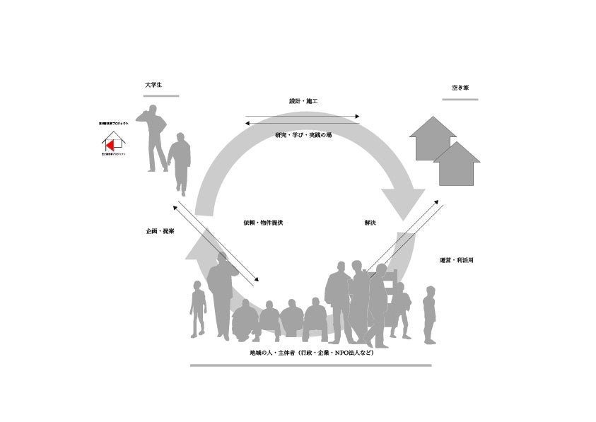 私たちは空き家の改修を通して、学生として学んだことを実践しながら経験を積み、そうして自分たちが作り上げた物件を地域の方や主体者の方に運営活用してもらう。そんな自分たちの活動を見て、空き家改修や企画の現場を提供してもらう。そういった相互関係によって私たちは成り立っています。