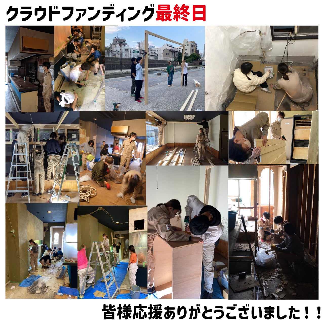 2023/01/31 12:00クラウドファンディングもいよいよ最終日になりました。本日はクラウドファンディングの総括と皆様へのお礼をさせていただければと思います。「自分たちの施工をより良いものにするために」と始めたクラウドファンディングでしたが、クラウドファンディングを行ったことが、想定以上に多くの人にこのプロジェクトを知っていただける良い機会になったと感じます。クラウドファンディングは本日で終了してしまいますが、プロジェクト自体は2月の中旬頃まで続きます。 また、物件は店舗としてこれからも東伊豆の「ヨリドコロ」としてまちに残ります。開店した際には、ぜひ私達学生の思いを、そして東伊豆の良さを思う存分に感じていただければと思います。まちの方々、プロジェクト関係者各位、そしてクラウドファンディングご支援者、皆様、最後までたくさんの応援ありがとうございます。皆様の応援が私達の力になります。皆様の応援に応えられるよう、プロジェクトの完遂を目指して、最後まで頑張りたいと思います。最後に改めまして、温かいご支援本当にありがとうございました。 もっと見る