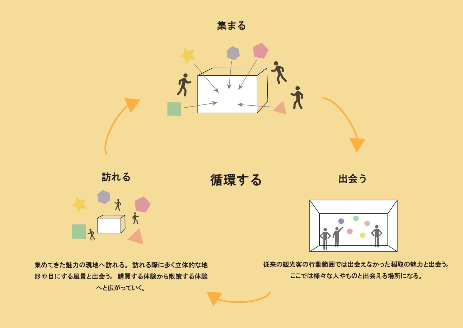 私たちはこの物件の改修を始める際、この物件をどのような場所にするかについて話し合いました。そして一つのテーマとして決められたのが「集まる、出会う、訪れる。ことの循環」でした。この物件を観光の魅力そのものにするのではなく、この街の魅力を知るための拠点のような場所にしようと考えたのです。