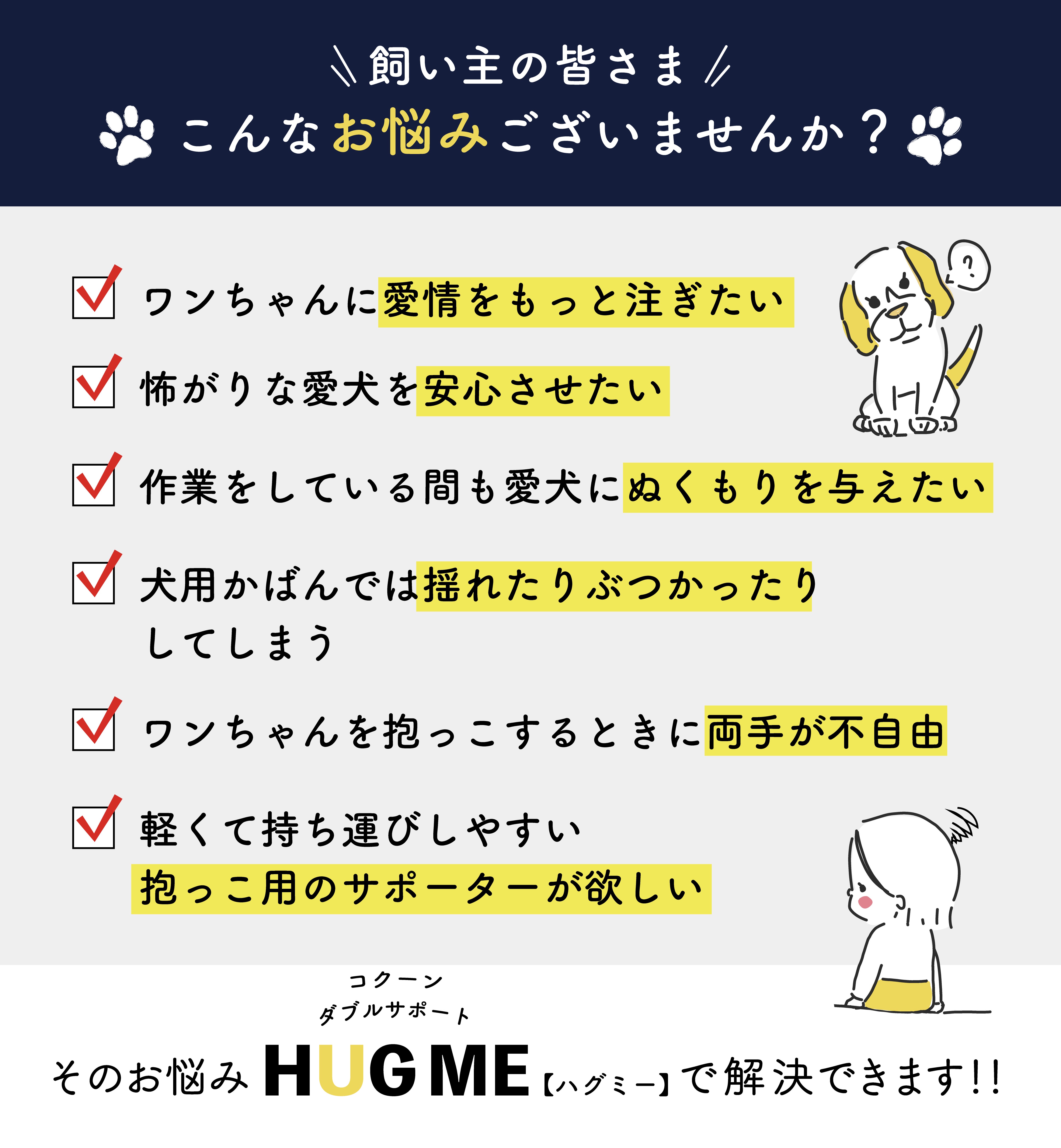 コクーン ダブルサポート『ハグミー』はそんな愛犬とのつながりを深めるために作られたワンちゃん用のサポーター(抱っこ紐)です。
