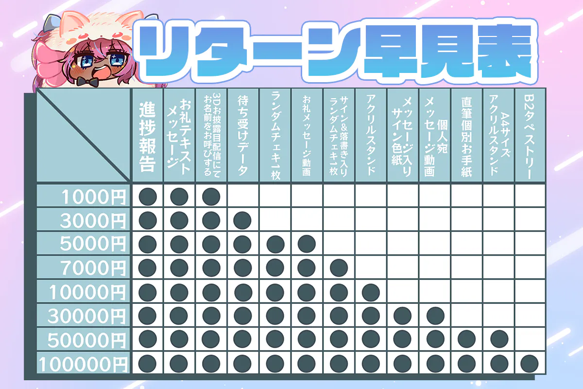 プランの値段が上がるにつれて、前プランにリターン品が追加されていきます。