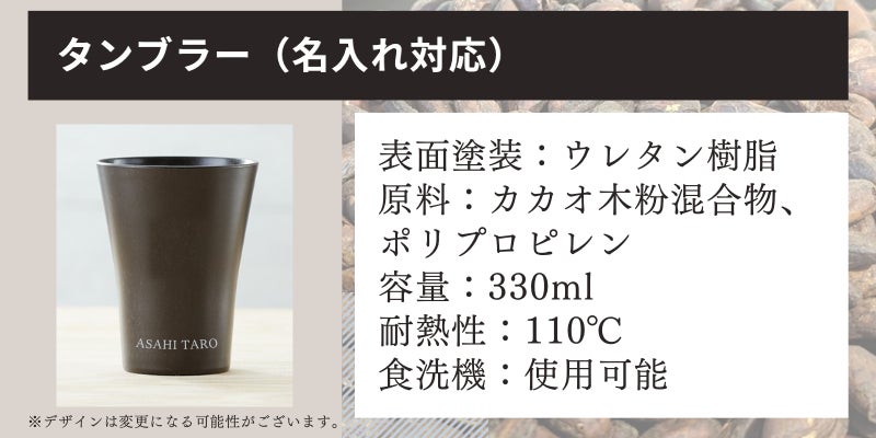 さらに、この上質なカカオハスクの香りを生かしたタンブラー開発にも着手。【Chocolates Make You HAPPY!!】とメッセージを添えた『カカオハスクの森のタンブラー』は、人気の商品になっています。(※本タンブラーはリターンには含まれません。)