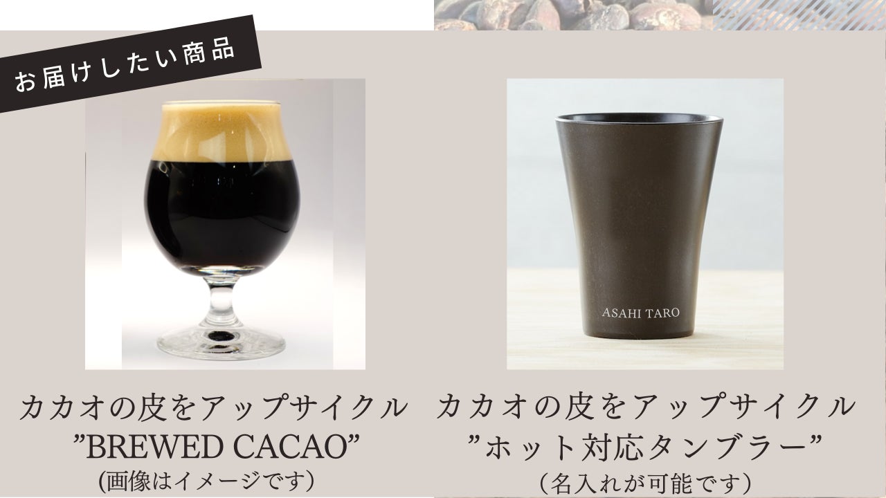 これまでチョコレートを製造する過程で捨てられていた『カカオハスク』を救う、カカオハスクスタウト『BREWED CACAO』、カカオハスクを原料に使用したタンブラーを開発して皆様に届けたいと思っています。
