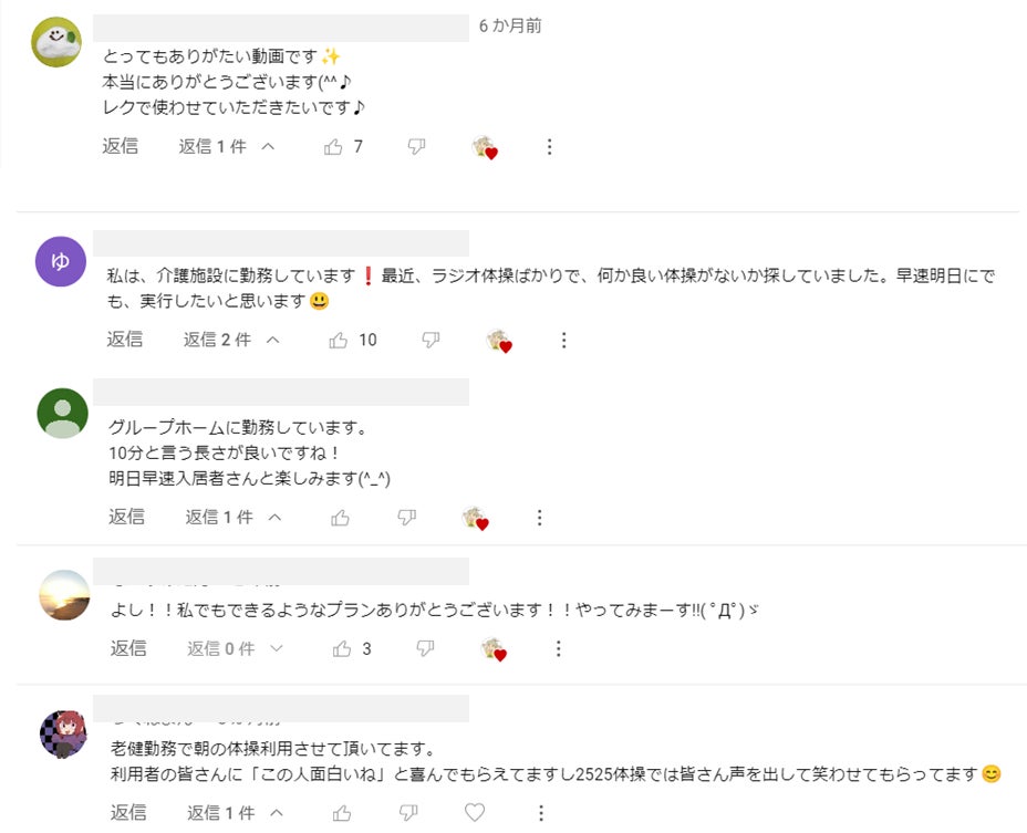 ●老健勤務で朝の体操利用させて頂いてます。利用者の皆さんに「この人面白いね」と喜んでもらえてますし2525体操では皆さん声を出して笑わせてもらってます😊