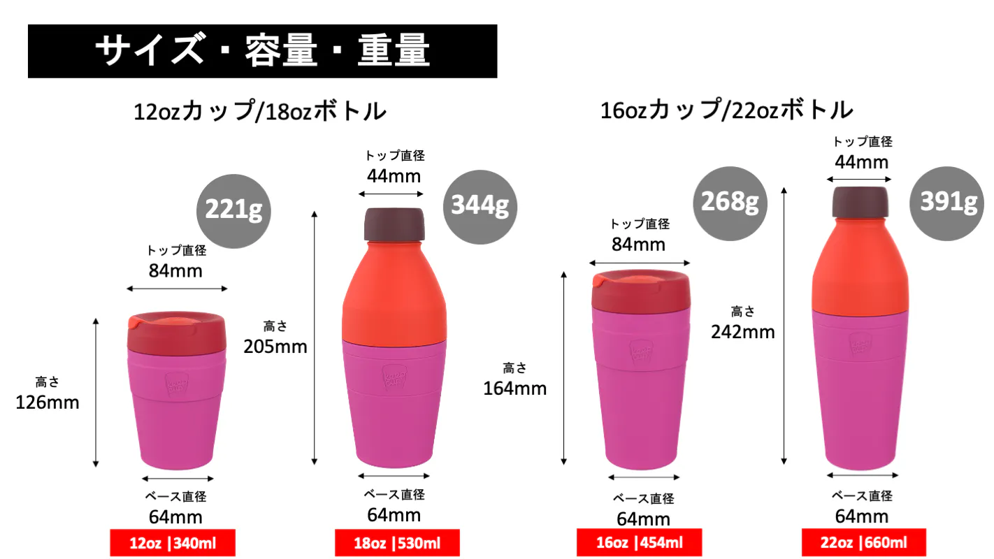 A. KeepCup独自の定義では、12ozカップ/18ozボトルは340mlカップ/530mlボトル、またアップサイズの16oz/22ozボトルは454mlカップ/660mlボトルとされています。12ozカップは大手コーヒーチェーンのトール/Mサイズ相当となります。カップでトールサイズ/Mサイズより多い量を飲まれる方、またボトルにいれる水なども沢山入れて持ち歩く方には、アップサイズがおすすめです。ご自身の飲用傾向を考慮してご判断いただければと存じます。