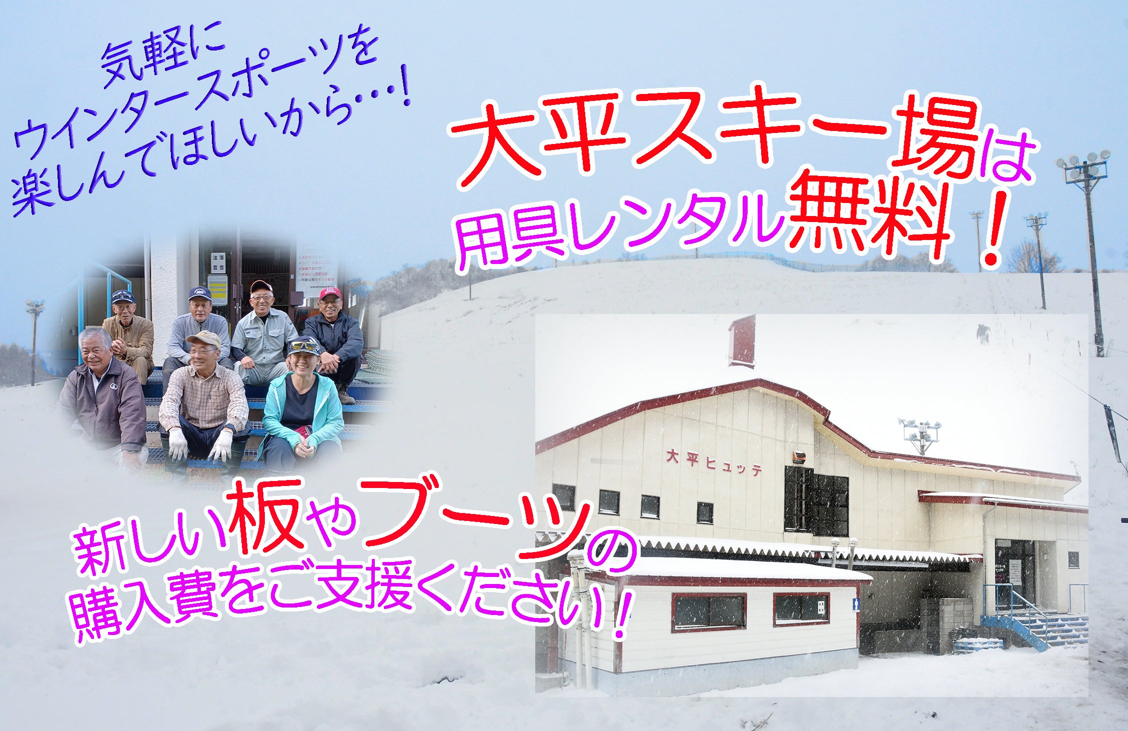 大平スキー場は本当に小さな小さな地域のスキー場です。東由利スキークラブで、管理運営に携わる主なメンバーは60~70代と高齢化も進んでいます。ただ、みんなこのスキー場が、東由利地域が大好き、その一心で動いています。大切な地域資源を生かして東由利を元気にしたいと思っています。ご支援よろしくお願いします。