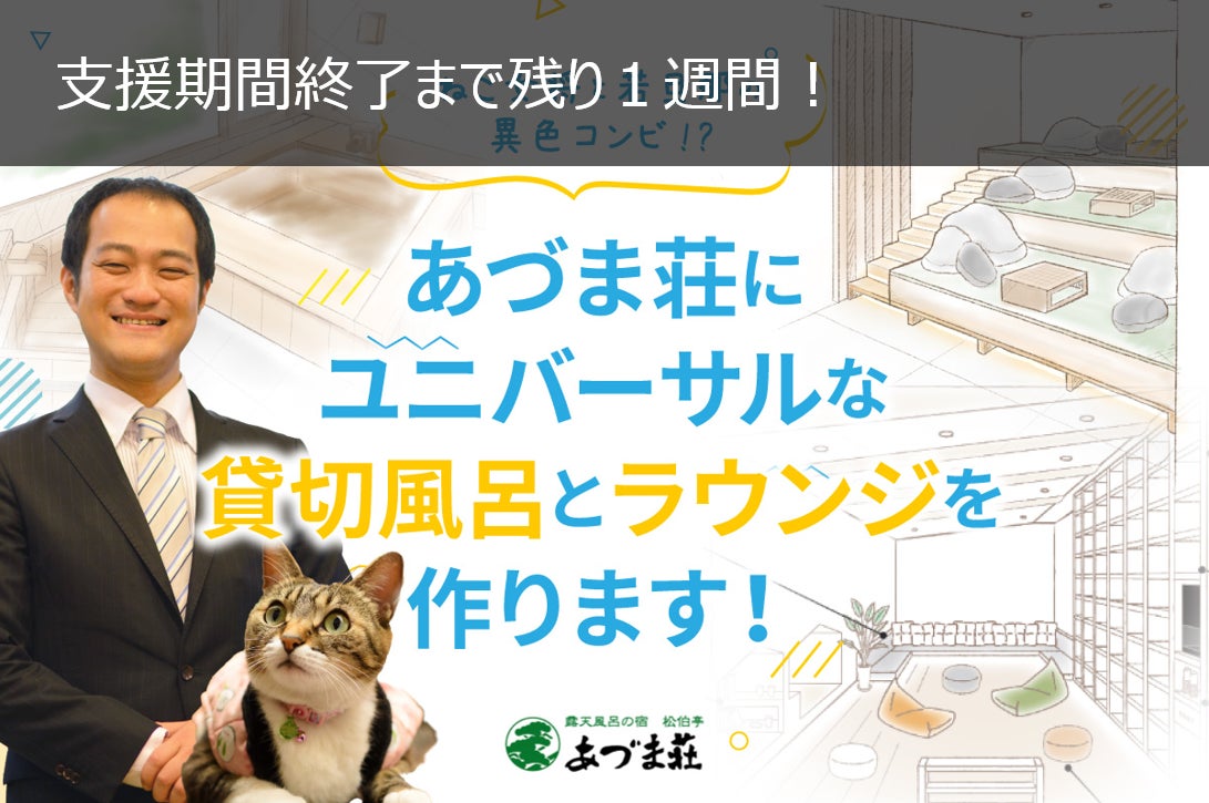 皆さんこんにちは!若旦那です!プロジェクトページをご覧いただきありがとうございます。 ついに、プロジェクト募集期間最終日となりました!現在の支援金額は2,428,000円、達成率は121%となっております。長いようで短かったこの1か月半。こんなに多くの方にご支援いただき、感謝の念が堪えません。 ◆リターン品ご購入いただけるのは本日まで◆   このクラウドファンディングでしか購入できない、お得なリターン品が多数ございます。 特に宿泊券は最大30%OFFの大特価!この機会をお見逃しなく!ご購入を忘れている商品はございませんか?お買い求めいただけるのは1/31(火)、本日までです! ◆あづま荘のペア宿泊券が当たる!Instagramキャンペーン開催中◆まもなく、プロジェクト募集期間は終了してしまいますが、Instagramキャンペーンは、2/3(金)まで実施中です! 本館和室の宿泊券+貸切風呂利用券が3組6名様に当たるチャンス!たくさんのご応募お待ちしております!↓↓公式アカウントはこちらから↓↓https://www.instagram.com/azumaso/プロジェクト終了まで残り数時間となりますが、最後までまいちゃんと一緒に走り切らせていただきますので、引き続き、応援をよろしくお願い致します!※プロジェクトをお気に入り登録しますと、募集期間終了後も活動報告が更新された際に通知が届くようになりますので、ぜひ、お気に入り登録をよろしくお願い致します。