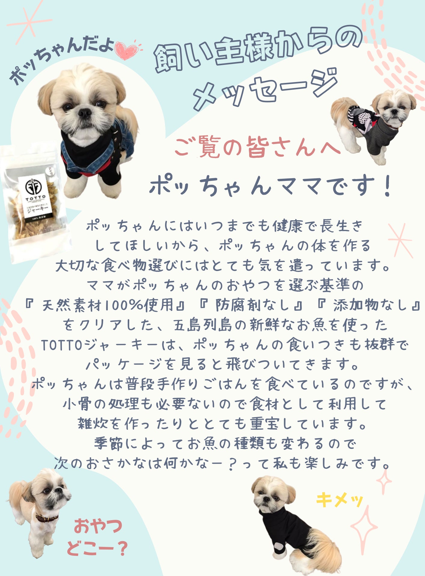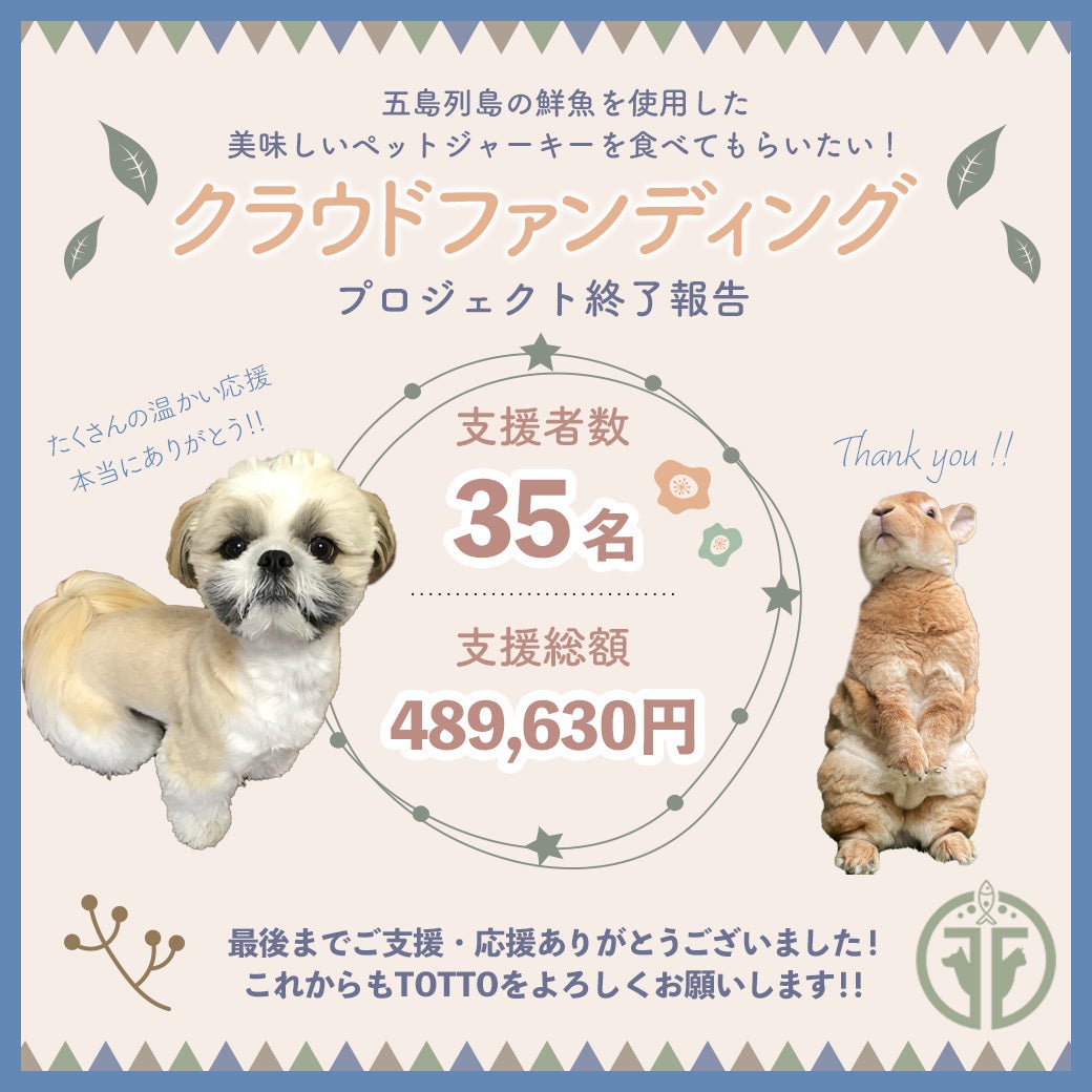 2023/01/23 18:00【クラウドファンディング終了報告】クラウドファンディングが22日をもって終了いたしました!皆様の温かい応援・ご支援誠にありがとうございました!12月から始まったクラウドファンディングは五島列島で獲れた美味しい「未利用魚」を活用した安心安全かつ健康的なお魚ジャーキーを皆様の家族の一員である全てのワンちゃんとネコちゃんに広めていきたい...そんな想いから活動して参りました。今回の結果は....支援者数:35名支援総額:489,630円皆様のおかげでここまで素晴らしい結果を残すことできました!本当に本当にありがとうございました!!そして、今回一緒にPR活動を頑張っていただいたTOTTO公式アンバサダーのポッちゃん!TOTTOの魅力をたくさんの方々に伝えてくれて誠にありがとうございました!!!!感謝の気持ちでいっぱいです!!他にもたくさんの方々にご協力いただきTOTTOジャーキーを広めていただきありがとうございました!改めてこの場で御礼申し上げます。今回のクラウドファンディングは期間限定のプロジェクトとなりますが今後もTOTTOは皆様にお魚ジャーキーをたくさんの方へ知っていただけるように...また、今回のTOTTOジャーキーを通じてできた大切なご縁を大切に頑張って参りますので引き続きどうぞよろしくお願いいたします。約1ヶ月半のクラウドファンディングの応援ありがとうございました!TOTTO※今回ご支援いただきました方々へのリターン品発送は2月ごろを予定しております。 お時間いただけますことご理解・ご了承いただけますと幸いです。 何卒よろしくお願いいたします。 もっと見る