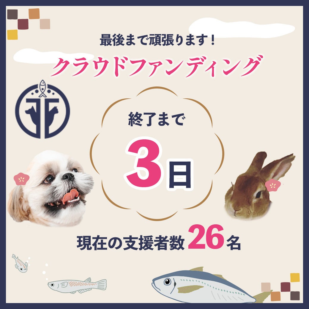【クラウドファンディング終了報告】クラウドファンディングが22日をもって終了いたしました!皆様の温かい応援・ご支援誠にありがとうございました!12月から始まったクラウドファンディングは五島列島で獲れた美味しい「未利用魚」を活用した安心安全かつ健康的なお魚ジャーキーを皆様の家族の一員である全てのワンちゃんとネコちゃんに広めていきたい...そんな想いから活動して参りました。今回の結果は....支援者数:35名支援総額:489,630円皆様のおかげでここまで素晴らしい結果を残すことできました!本当に本当にありがとうございました!!そして、今回一緒にPR活動を頑張っていただいたTOTTO公式アンバサダーのポッちゃん!TOTTOの魅力をたくさんの方々に伝えてくれて誠にありがとうございました!!!!感謝の気持ちでいっぱいです!!他にもたくさんの方々にご協力いただきTOTTOジャーキーを広めていただきありがとうございました!改めてこの場で御礼申し上げます。今回のクラウドファンディングは期間限定のプロジェクトとなりますが今後もTOTTOは皆様にお魚ジャーキーをたくさんの方へ知っていただけるように...また、今回のTOTTOジャーキーを通じてできた大切なご縁を大切に頑張って参りますので引き続きどうぞよろしくお願いいたします。約1ヶ月半のクラウドファンディングの応援ありがとうございました!TOTTO※今回ご支援いただきました方々へのリターン品発送は2月ごろを予定しております。 お時間いただけますことご理解・ご了承いただけますと幸いです。 何卒よろしくお願いいたします。