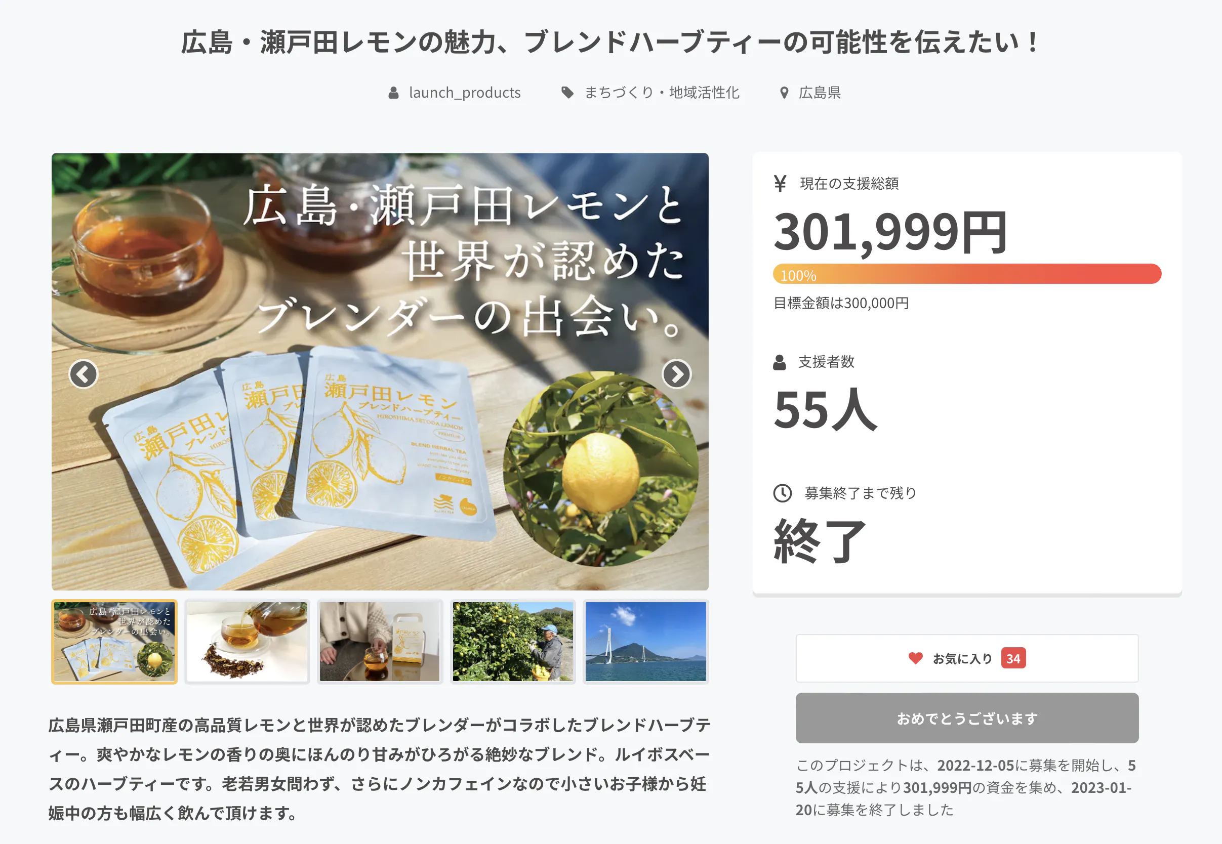 2023/02/06 15:30こんにちは!本日リターン商品の発送がすべて完了しましたことをお知らせいたします。お手元に届くまで今しばらくお待ち下さいますようお願い申し上げます。※このメールより1週間以上経ってもお荷物が届かない(不在票が入っていない)場合はメールにてお知らせください。速やかに対応致します。今後はONLINE SHOPとInstagramにて発信していきますのでぜひご覧ください!またお手元に届きましたらInstagramでにて感想教えて頂けると嬉しいです♪・@launch_productsのタグ付け・#瀬戸田レモンブレンドハーブティー改めまして、クラウドファンディング「広島・瀬戸田レモンの魅力、ブレンドハーブティーの可能性を伝えたい!」にご支援頂きありがとうございました。==================================▼ 広島・瀬戸田レモンブレンドハーブティーONLINE SHOPhttps://launch.buyshop.jp▼ 広島・瀬戸田レモンブレンドハーブティーInstagramhttps://www.instagram.com/launch_products/================================== もっと見る発送準備中です!