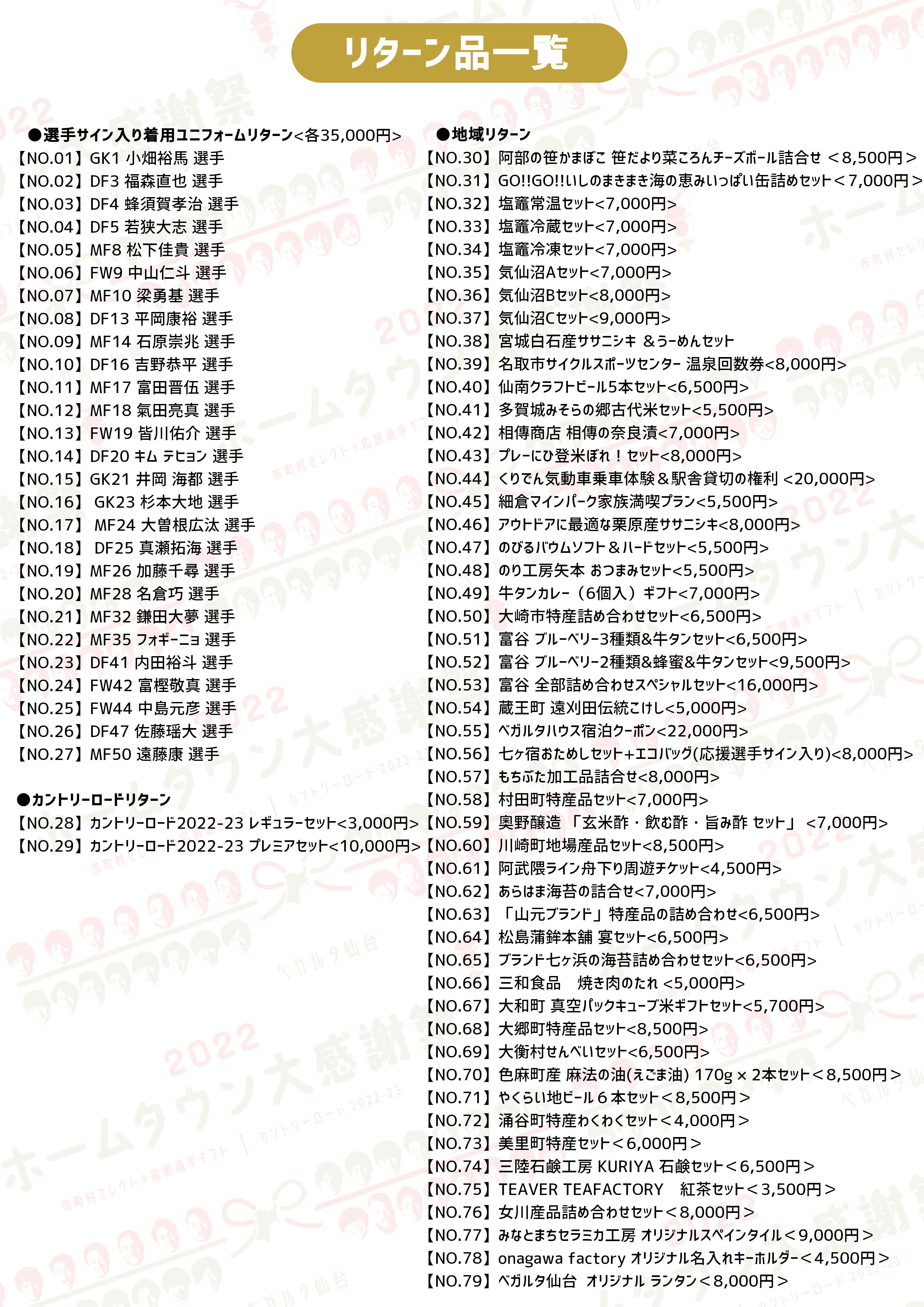 そしてこの度、新たにホームタウンを応援する新企画として、宮城県35自治体の特産品とベガルタ仙台のコラボ商品をリターン品としたクラウドファンディングを実施いたします。宮城県35自治体がお勧めする食品や地域の体験型商品、選手たちのユニフォーム、2023シーズンの広報誌「カントリーロード」など、ここでしか手に入らないリターン品も数多くございますので、ぜひお買い求めください。