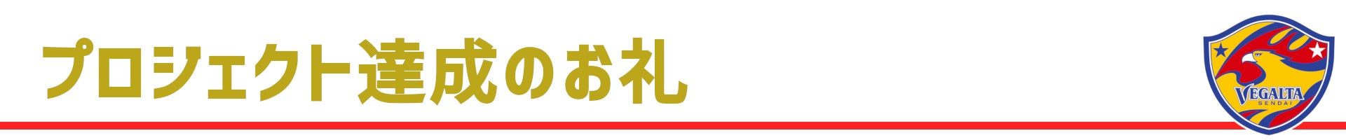 ベガルタ仙台は、ホームタウンを応援する新企画として、宮城県35自治体の特産品とベガルタ仙台のコラボ商品をリターン品とした本プロジェクトを11月19日(土) 12:00よりスタートいたしました。みなさまのご支援により、目標額としておりました300万円を達成する事が出来ました。この短期間で目標を達成できたこと、ご支援を賜ったみなさまのお気持ちに対し、心より感謝申し上げます。