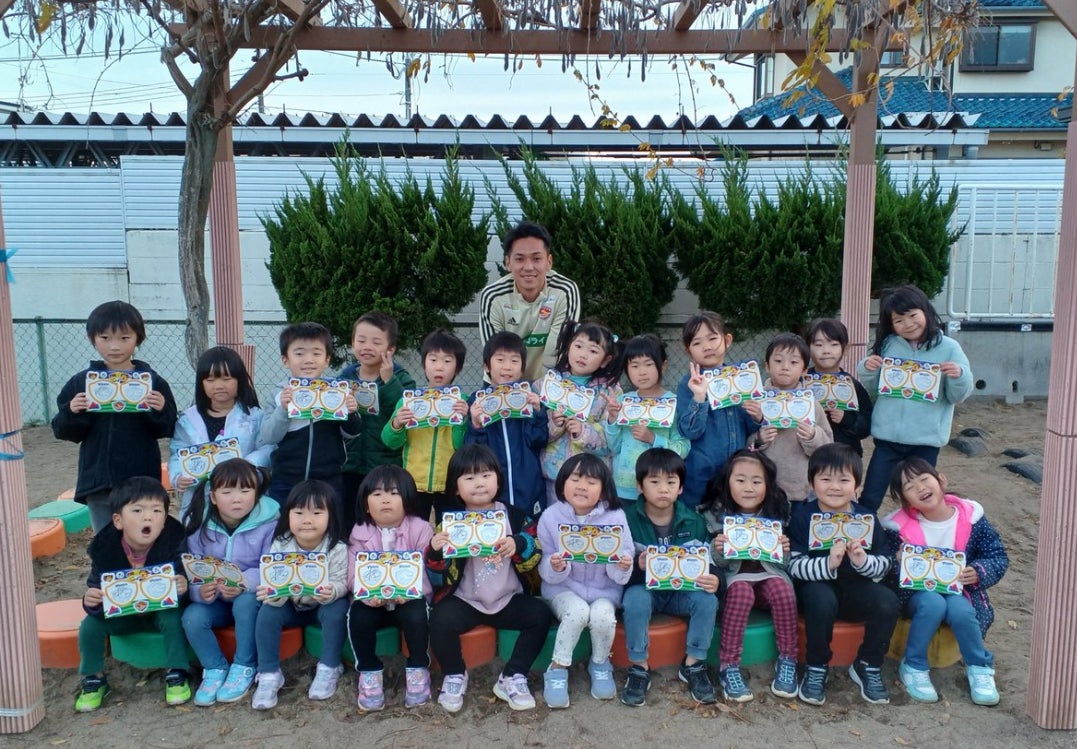 なかよし保育園では、最初はサッカーが怖いと言っていた子も、フレンドリーなヨシキ先生といつの間にかニッコリ仲良しになりました。「よしきせんせー」からパス交換の後は、先生の鬼ボールキープ。質問コーナーでもボールを失いません。さすが!