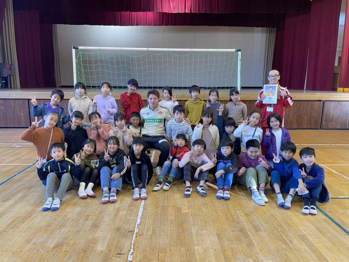 持久走大会前ということで、子ども達と一緒にランニングしシュートも披露しました。