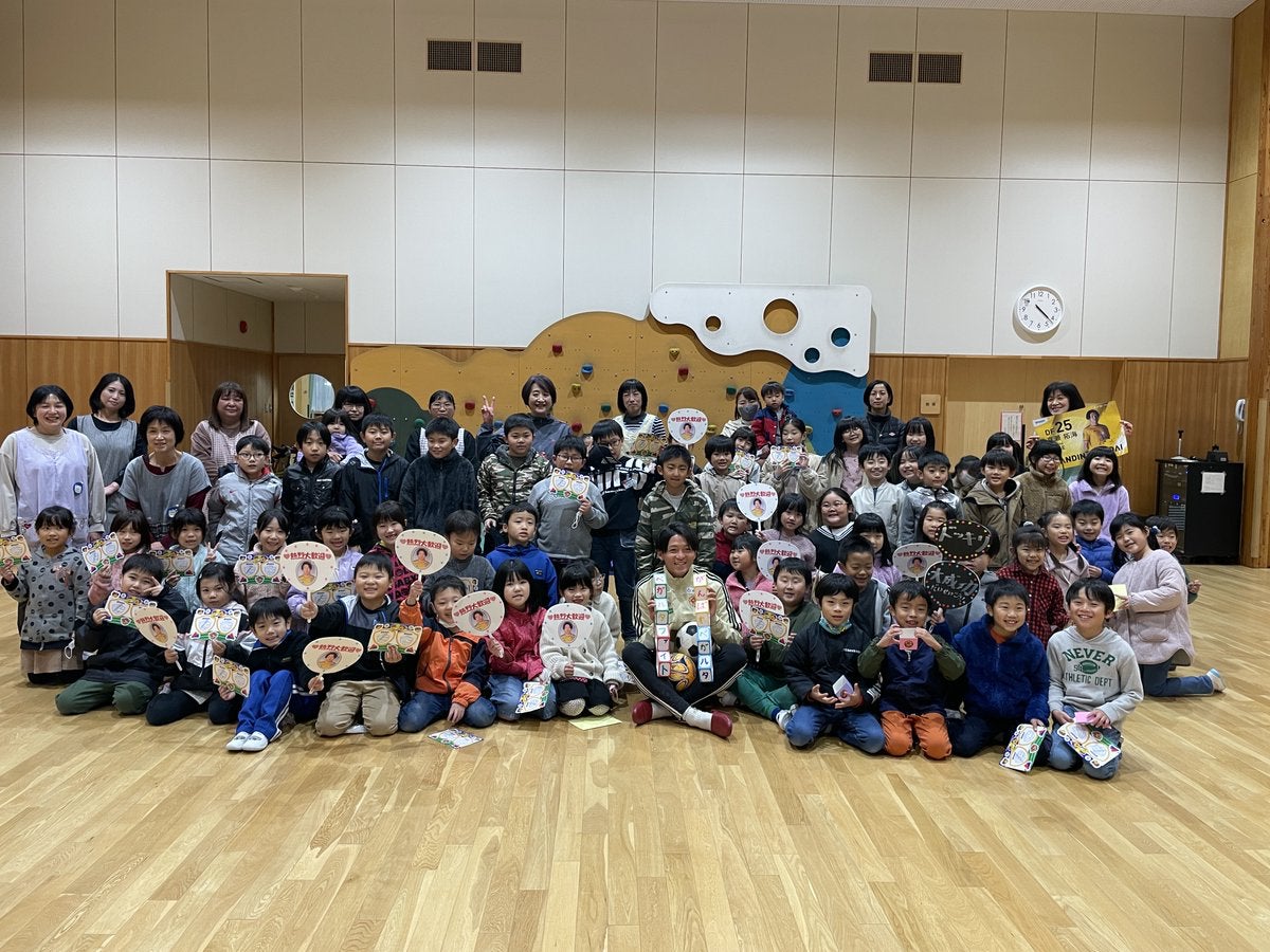 出迎えてくれた子どもたちの手には、お手製の熱烈大歓迎「真瀬選手応援うちわ」