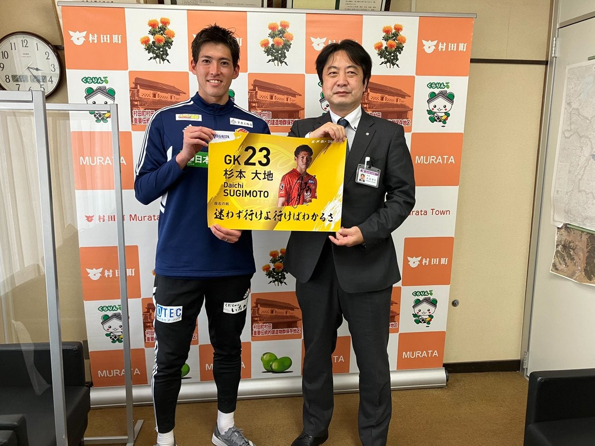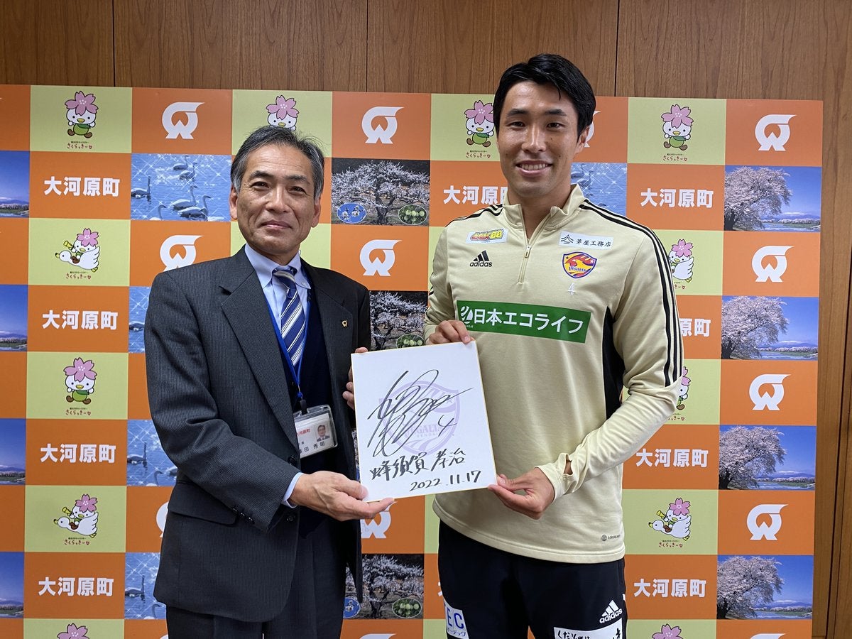 蜂須賀孝治選手は大河原町を表敬訪問。今後さらにスポーツを通じたまちづくりに力を入れていくという同町から、「来季はぜひJ1昇格を!」と激励のお言葉をいただきました。