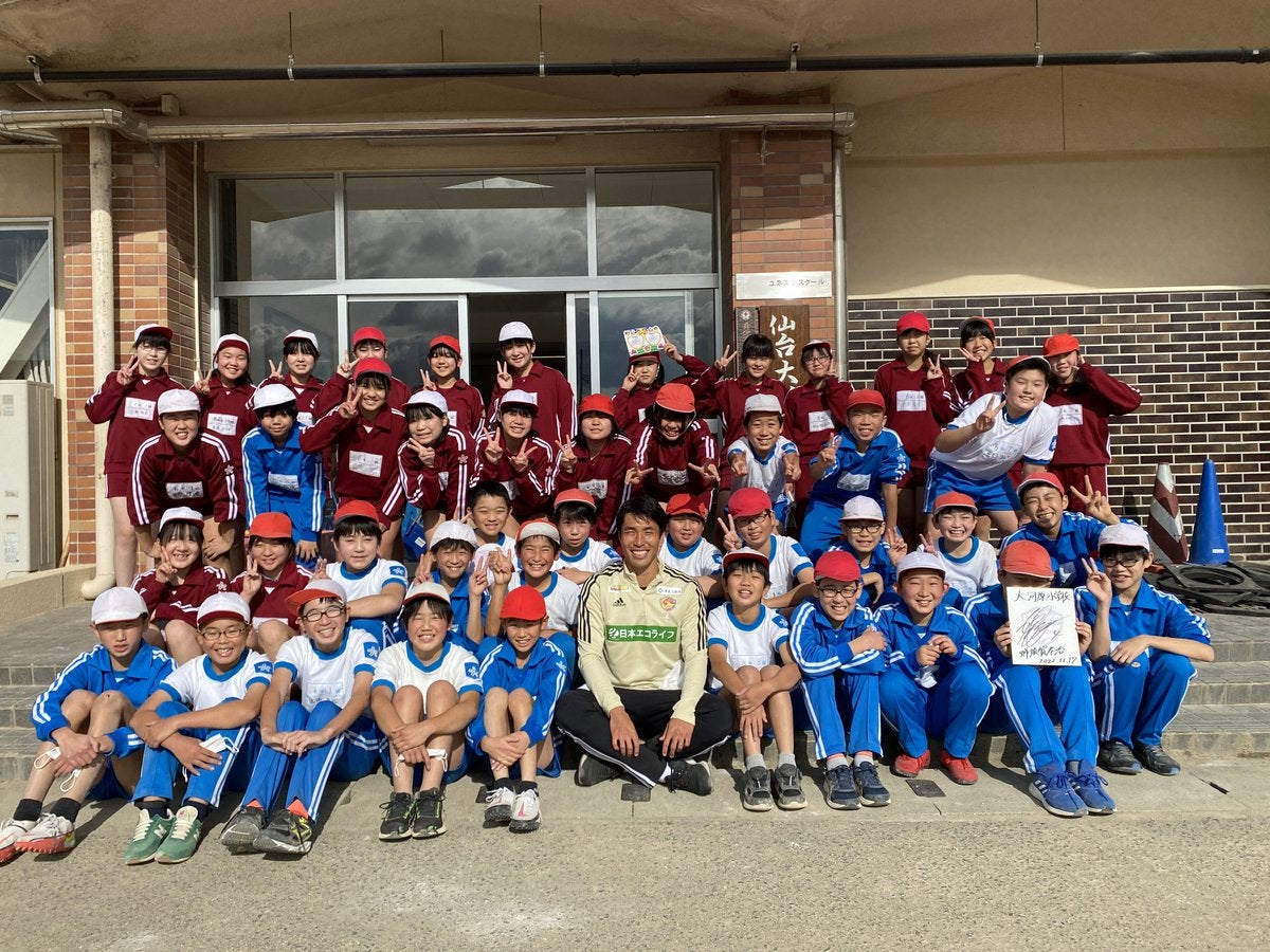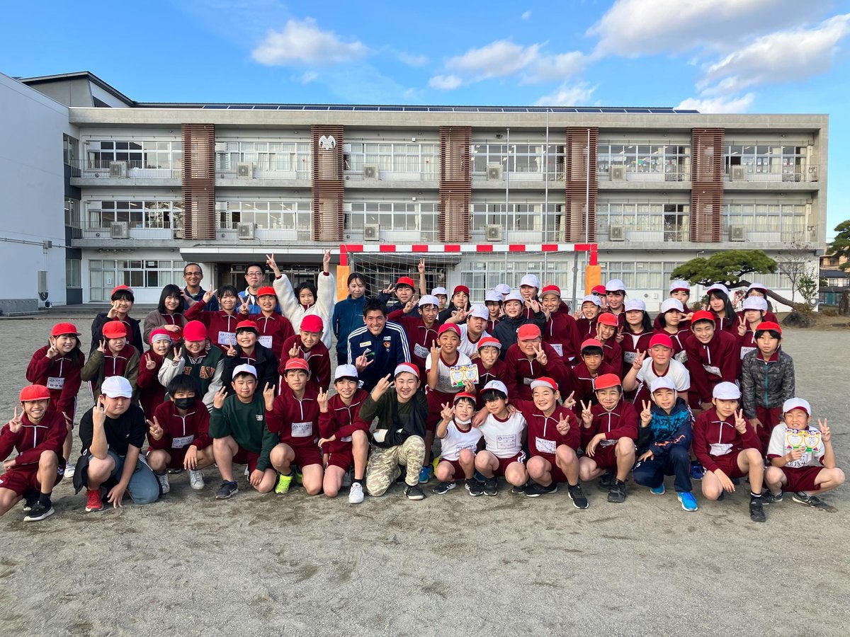 その後は村田小学校を訪問。質問コーナーでは、好きな選手「オリバー・カーン」&あこがれた選手「川口能活」を誰も知らず、子どもたちとのジェネレーションギャップを感じる場面も。最後はPK対決で大変盛り上がりました!