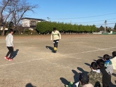 仙台のゲームメーカーがテクニックとスピード、シュートで6年生を驚かせ魅了。集合写真撮影まで大喜びの時間になりました。 七ヶ浜町役場では、今季の結果報告と応援への感謝、来シーズンの決意はもちろん、地域貢献活動について歓談、のぼりもしっかり贈呈しました。