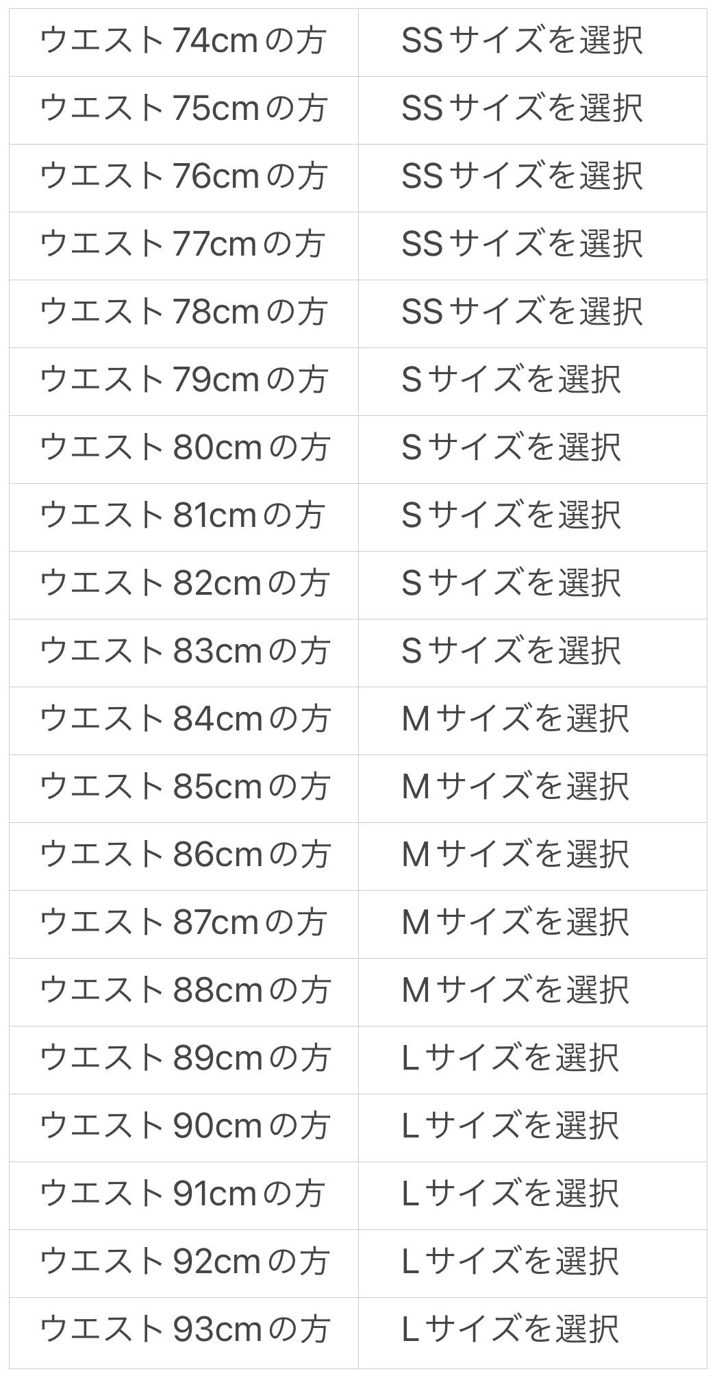 大まかなウエストサイズ(cm)からの目安として、以下の通りご選択ください。
