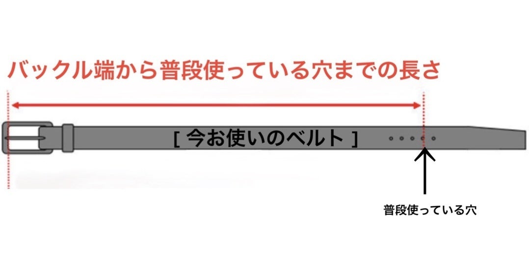 ※ベルトは、締め具合の好みなどで個人差がありますので、現在お使いのベルトがお手元に御座いましたら、次の様に計って上記イメージ図の位置と見比べると、より正確です。