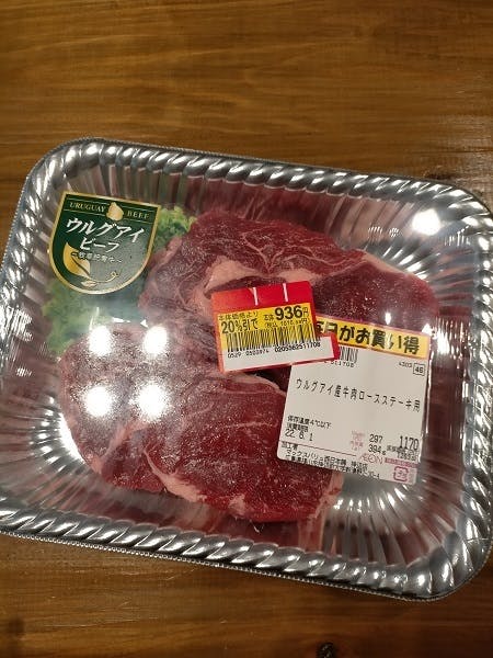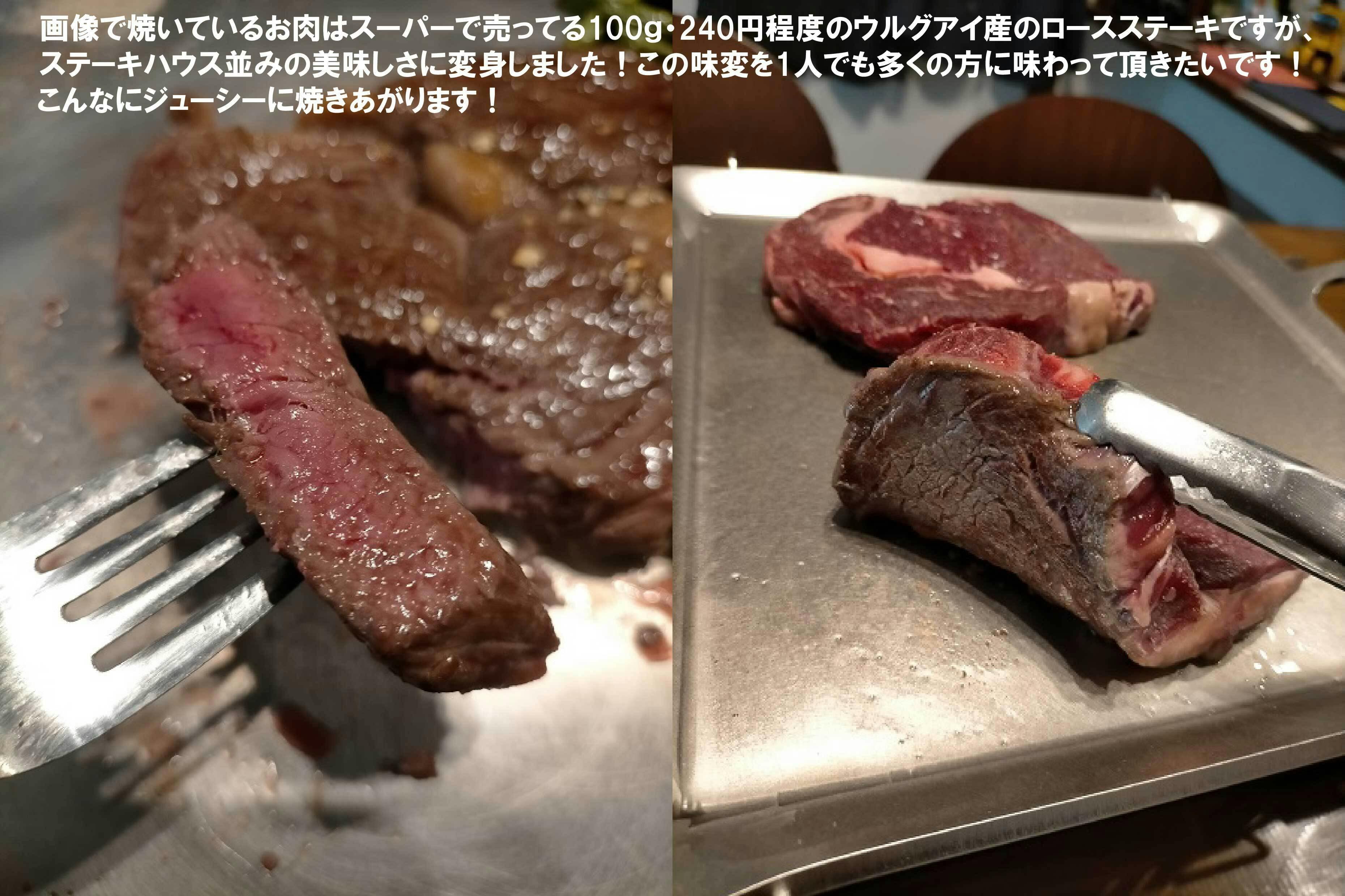 動画で焼いているお肉はスーパーで売ってる100g/240円くらいの安いウルグアイ産のロースステーキですが、