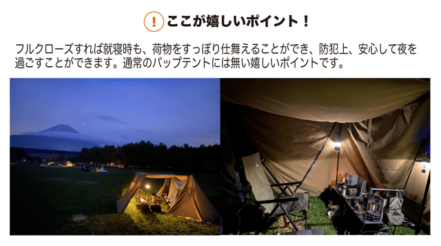 □ テント自体が狭く就寝時にはテーブルや椅子、などの道具類を外に放置したままテントをクローズしなければいけない場合が多く、防犯上の心配が常にある。