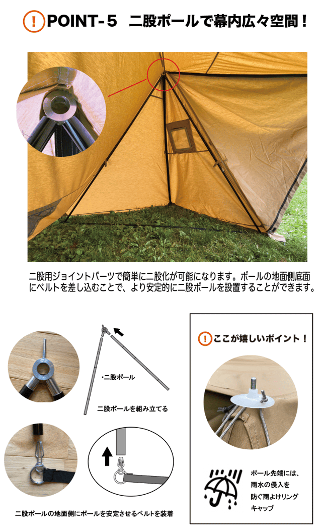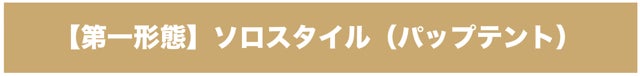 基本形態であるパップテントスタイル。「transHOME-EX」はテント内の高さが160cmあります。一般的なパップテントはテント内の高さが100cm~130cm程度しかない場合が多く、中での移動は体を折り曲げないとできず、腰の負担が大きい場合があります。「transHOME-EX」なら、少し屈む程度でテント内を行動でき、その負担はかなり軽減できると考えています。さらにソロキャンプとしては大きめのサイズ感で設計されています。しかもテントを立ち上げるポールは、二股ポールを採用しているため、デッドスペースが少なく快適な居住空間が確保できます。