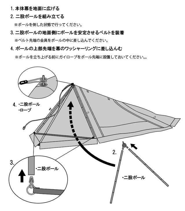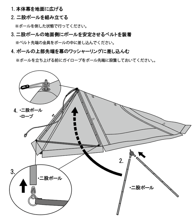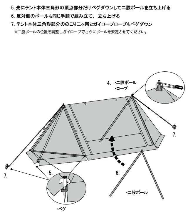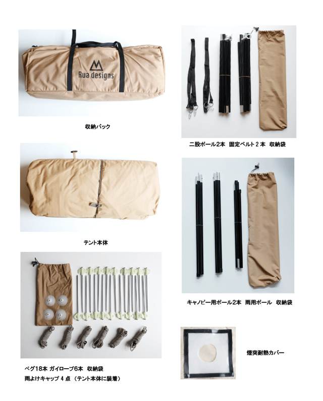 付属品:ペグ18本 ガイロープ6本 二股ポール2本 キャノピー用ポール2本 雨用ポール1本