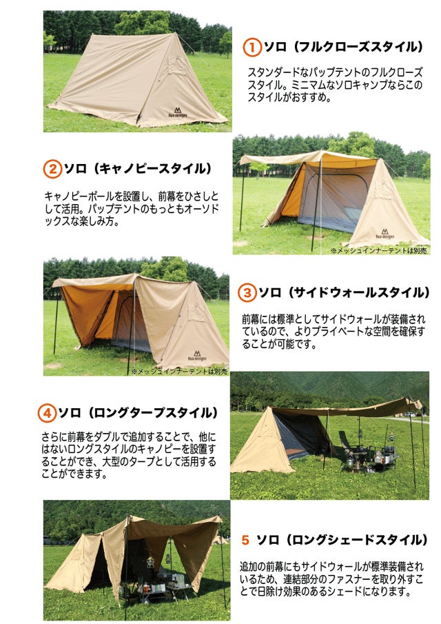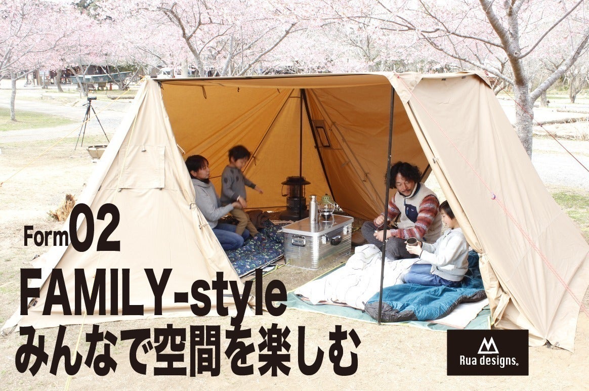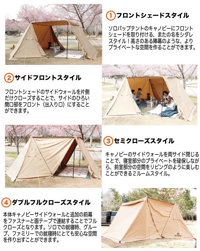 4面あるサイドウォールの組み合わせで、両面開放型のフロントシェードスタイルや、片面クローズで横面大開口の出入り口が確保できる、サイドフロントスタイル。まるで2ルームテントのような空間を創り出すことが可能です。組み合わせで演出できるスタイルは無限大!あなたの空想でファミリーキャンプがより一層楽しいものになるはずです。