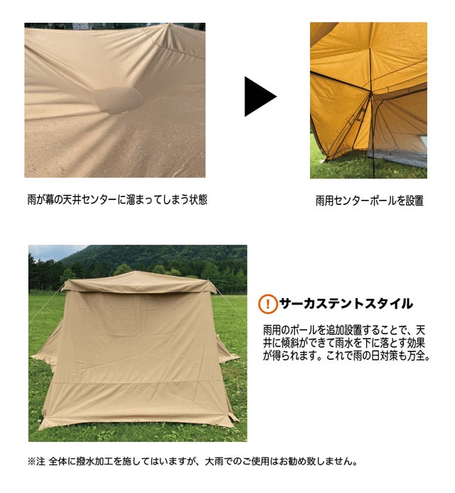 □ ポリエステル素材のテントに比べてコットン素材のテントは雨に弱いとう弱点を抱えています。テントのハトメ部分から雨が侵入することも・・・