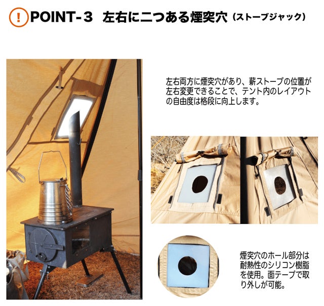 □ 最近はストーブジャックが装備されているパップテントも見かけるようになったが、ほとんどのパップテントは片側にしか煙突穴が無いため、ストーブを置く場所が自由に変更できない。