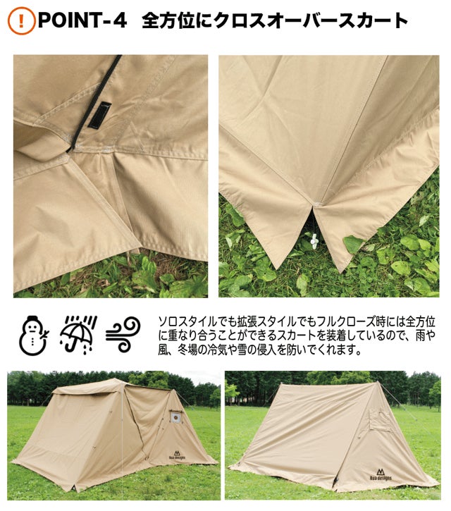 基本形態であるパップテントスタイルに前幕をファスナーでジョイントすることで、「transHOME-EX」はテント内の広さが通常のパップテントの約3倍の広さを作り出すことができます。