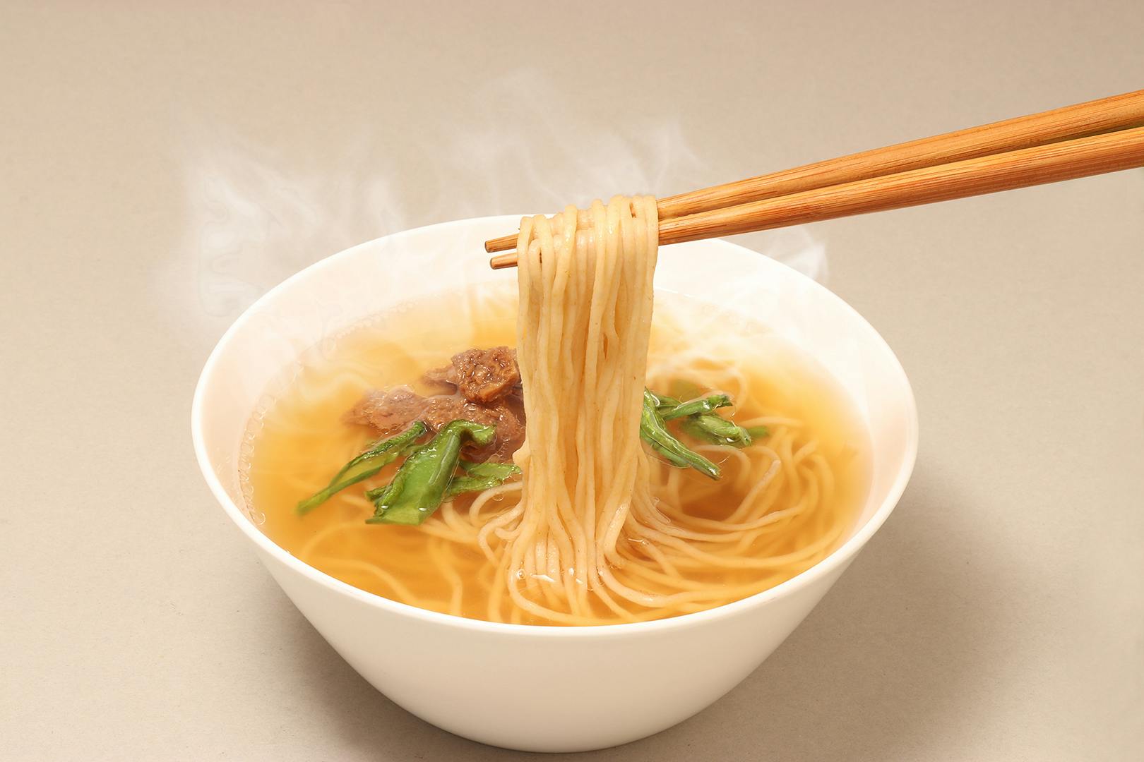 カムット小麦由来のコシに、工程の工夫によりモチモチとした食感に。 スープとよく絡むノンフライの中細麺です。