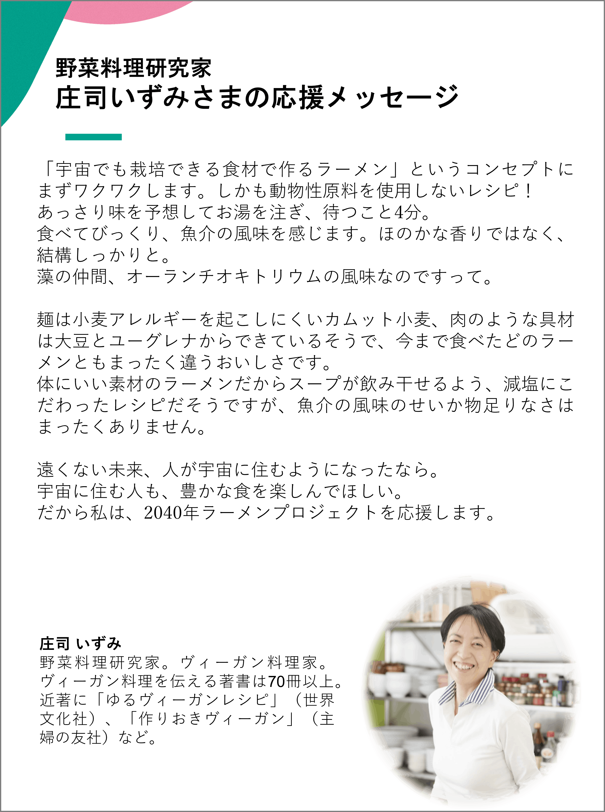 最後までお読みいただきありがとうございます。私たちはこのプロジェクトを通じて、「宇宙食3.0」を実現させ、宇宙での長期滞在においてもサステナブルかつ栄養バランスに優れた食事の提供を目指しています。。本当に美味しい未来のラーメンの味を堪能していただき、「宇宙食3.0」の実現に向けたご意見やフィードバックをどうぞよろしくお願いいたします!